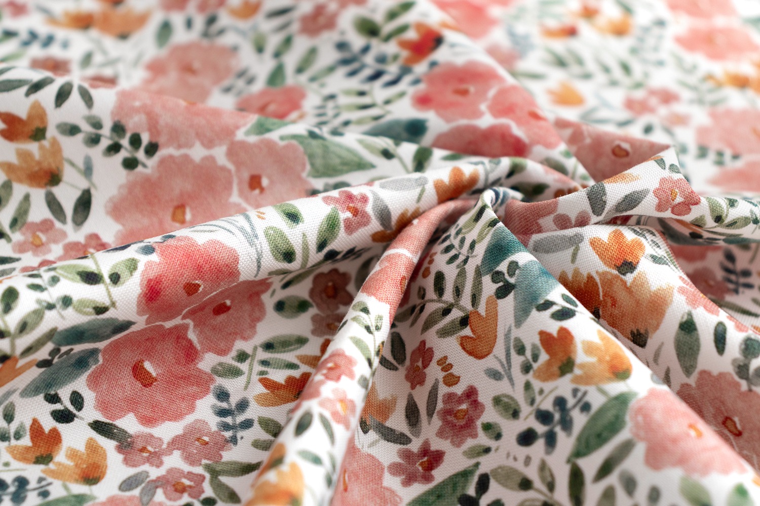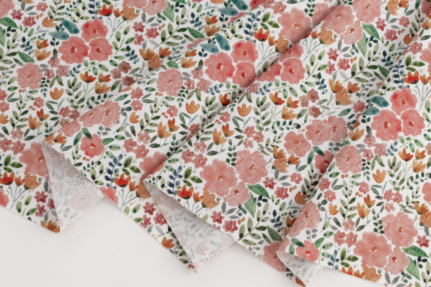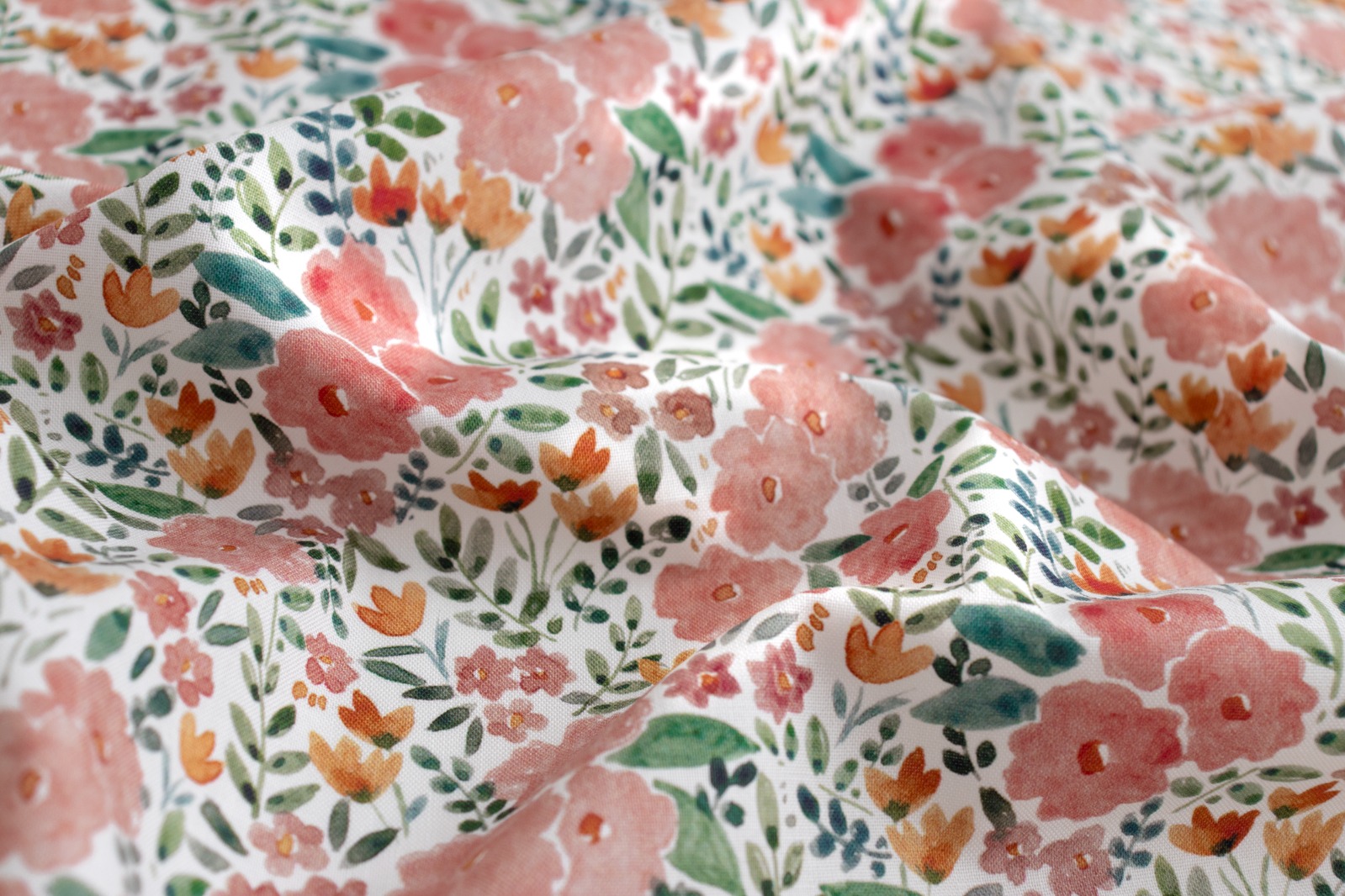 ホワイト地に、くすみピンク系の草花が水彩画タッチで生地いっぱいに描かれています。