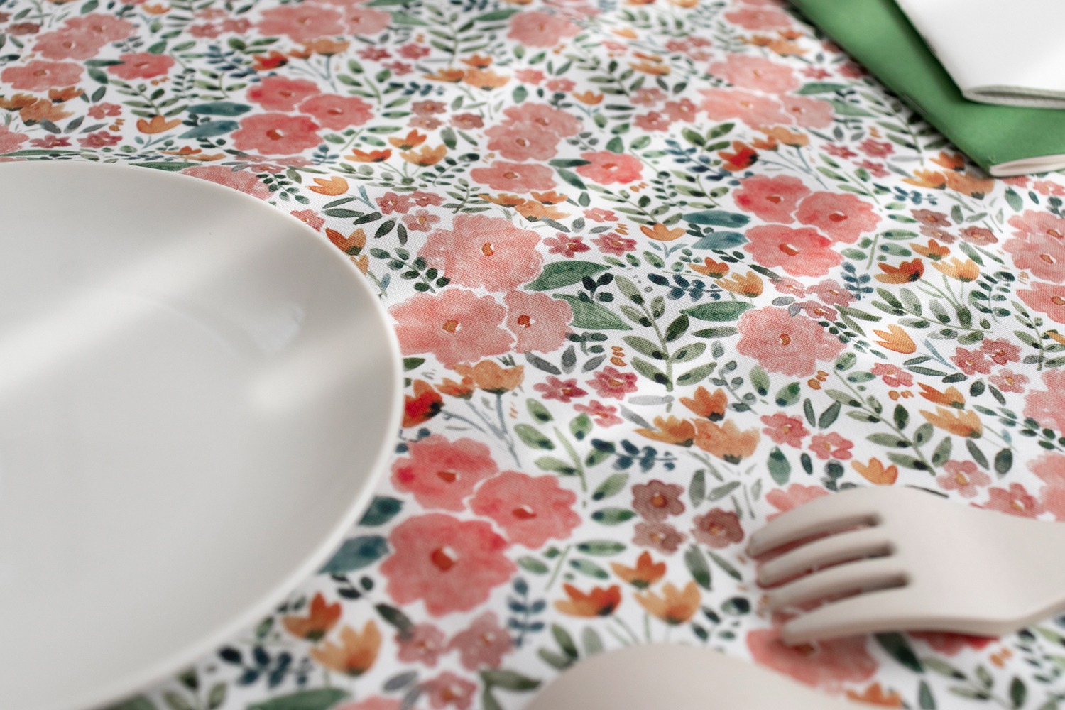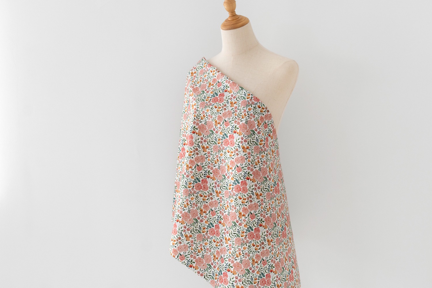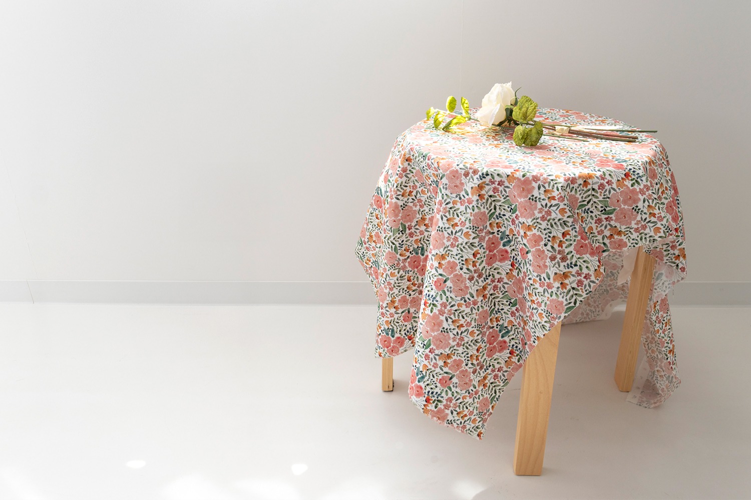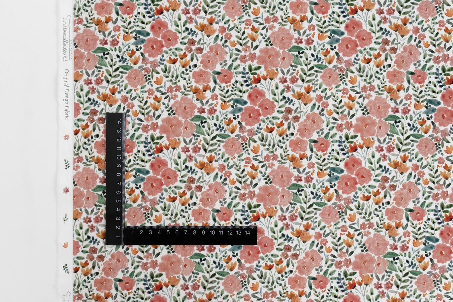 ホワイト地に、くすみピンク系の草花が水彩画タッチで生地いっぱいに描かれています。