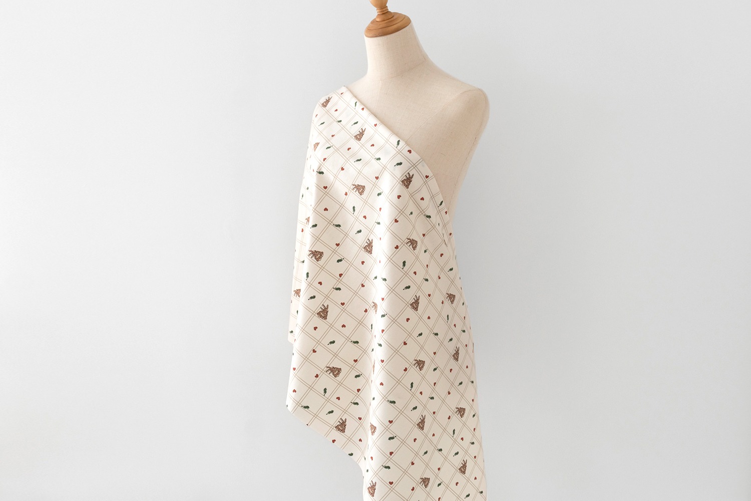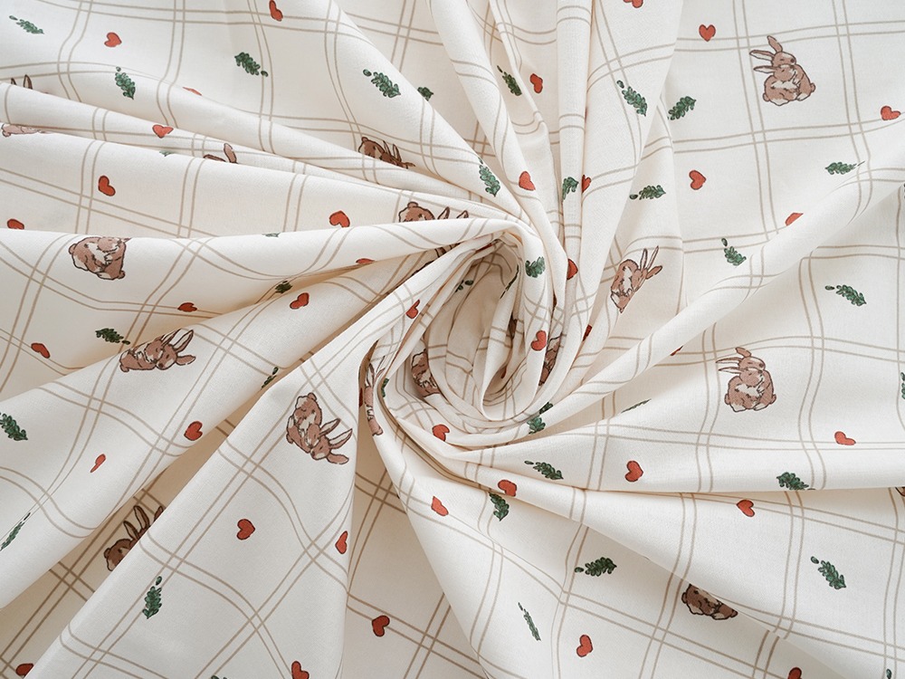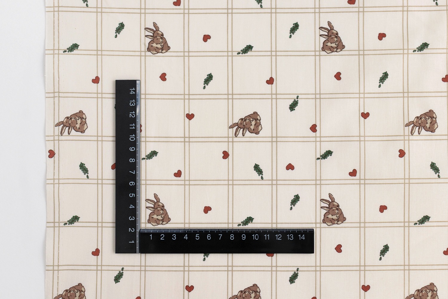 生成り地に、親子のうさぎ、ハート、葉っぱ、チェックが描かれたナチュラルなデザインです。