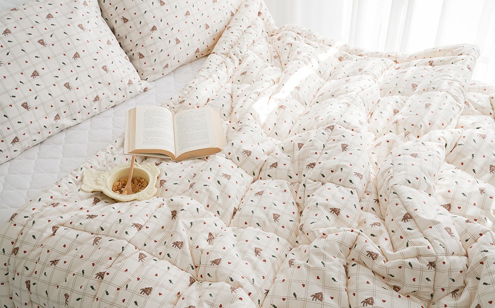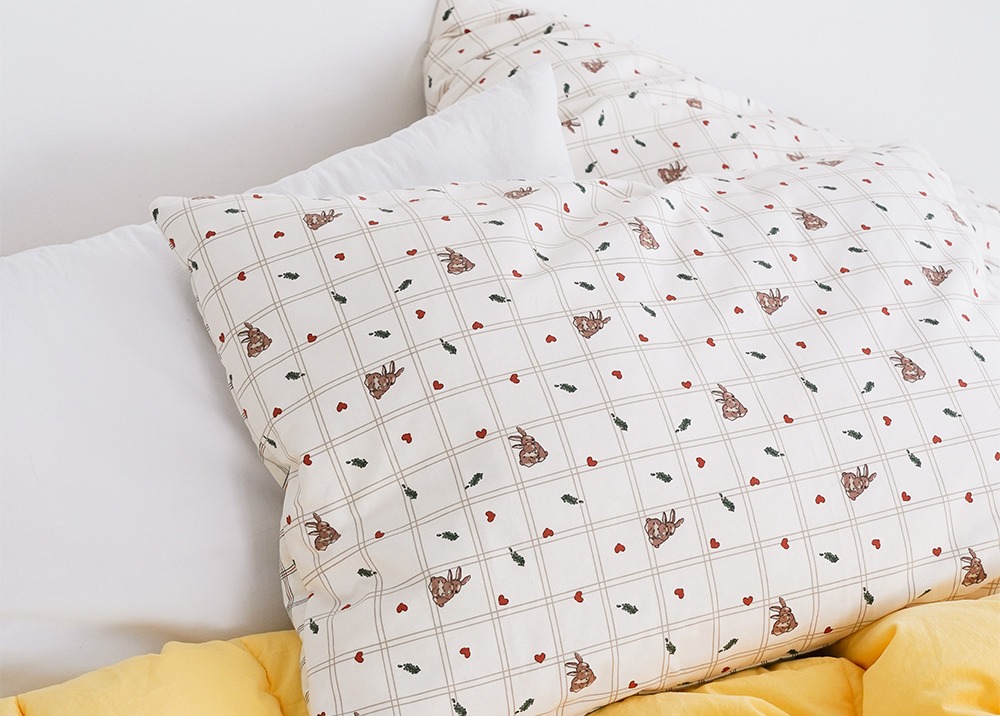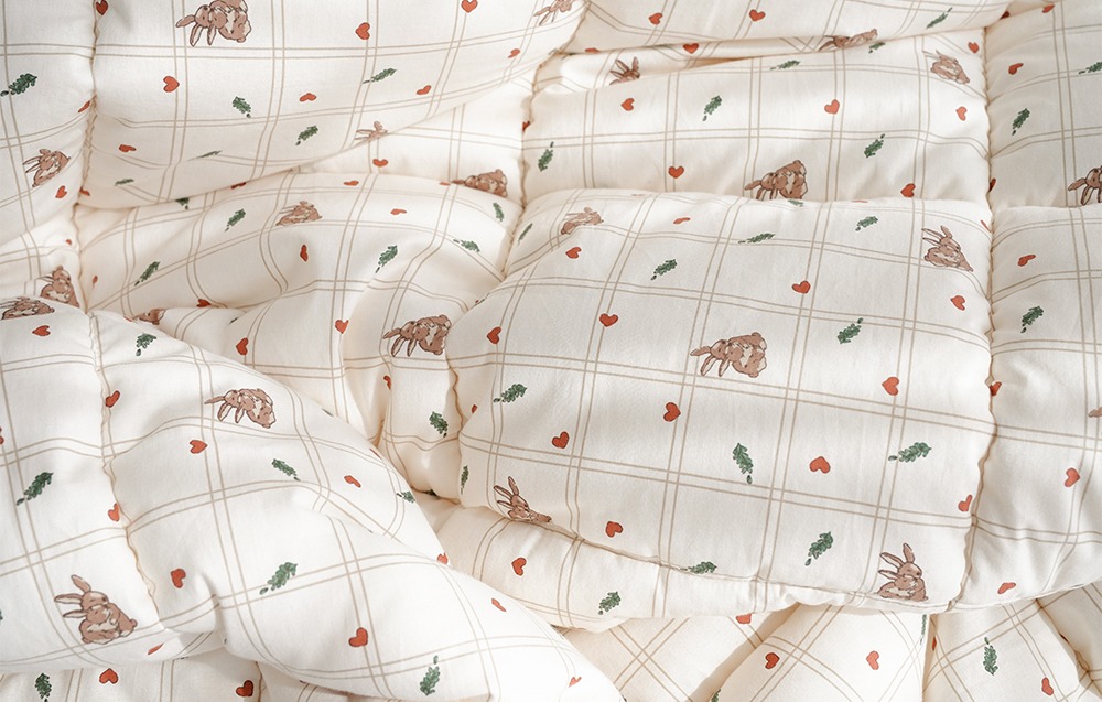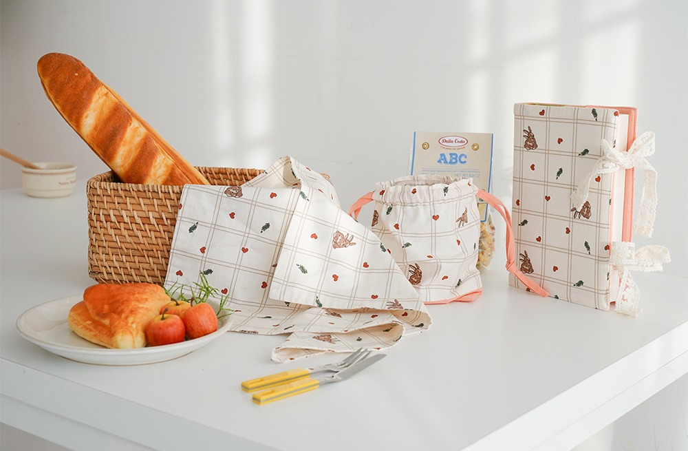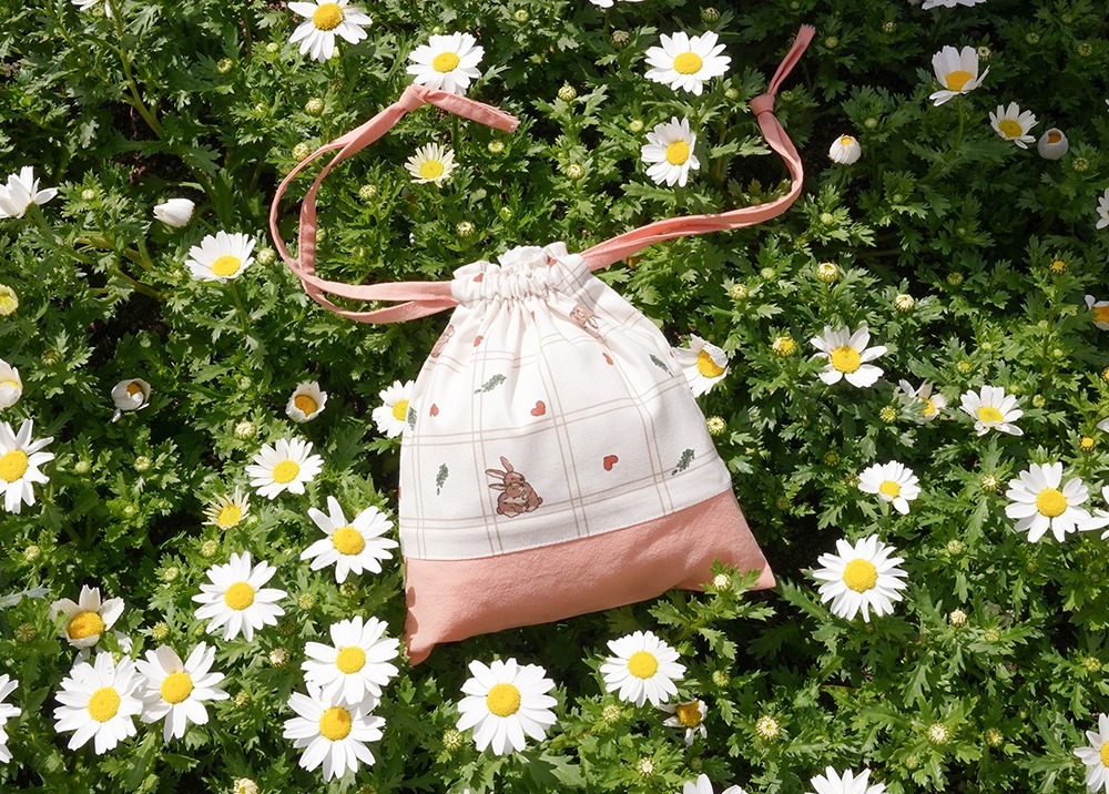 生成り地に、親子のうさぎ、ハート、葉っぱ、チェックが描かれたナチュラルなデザインです。