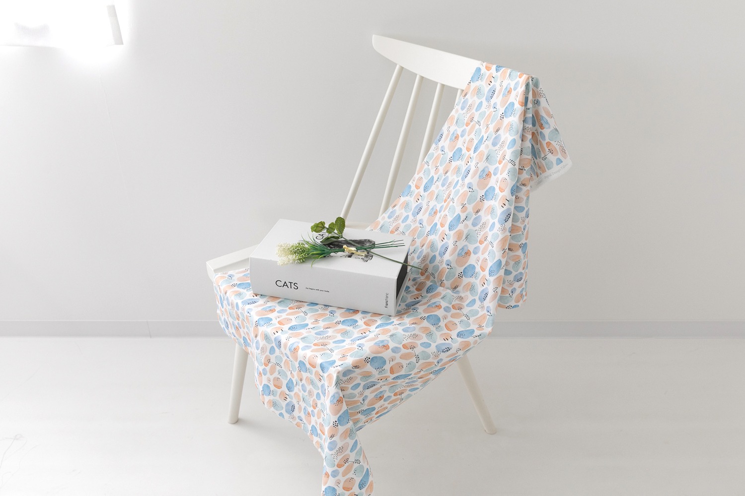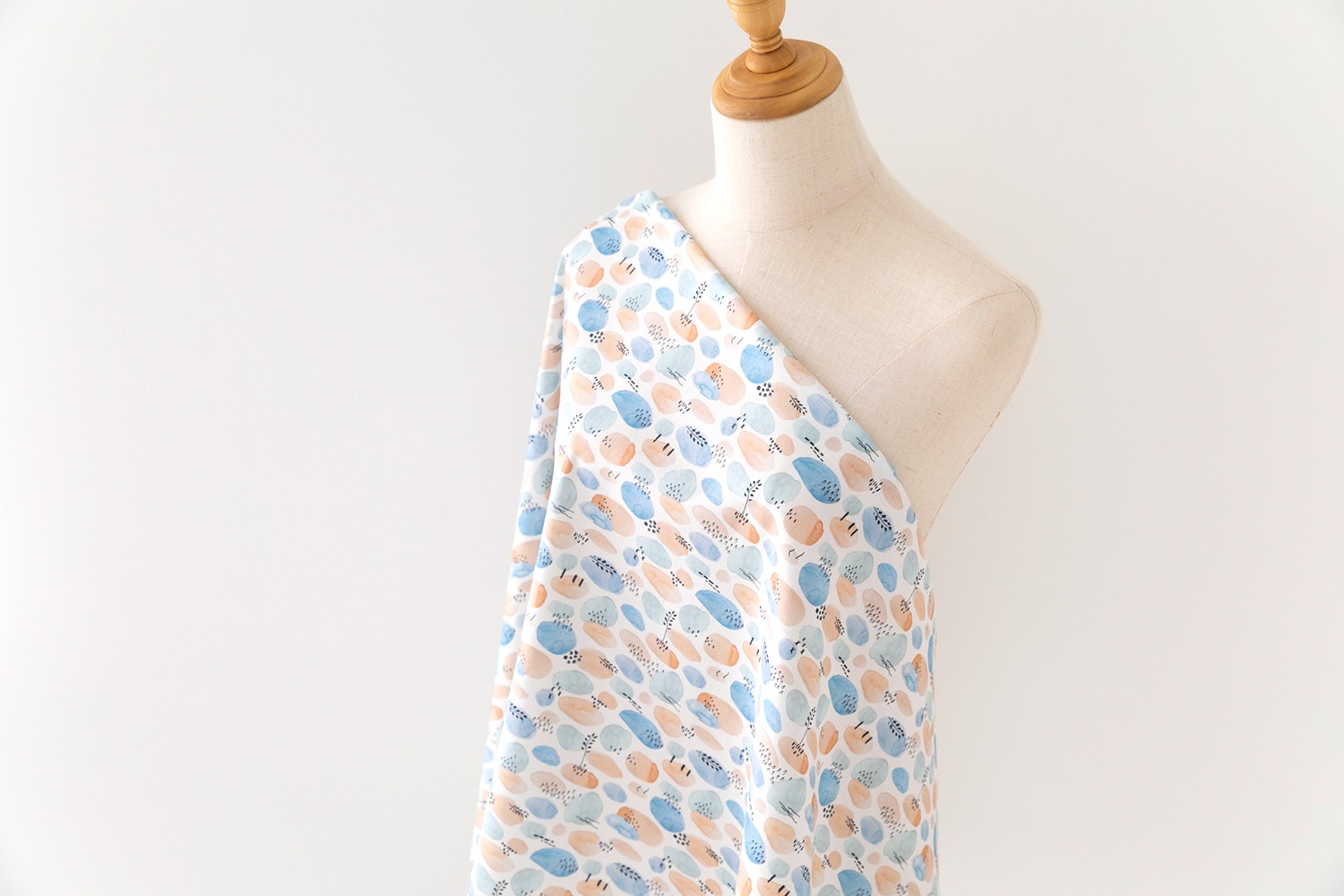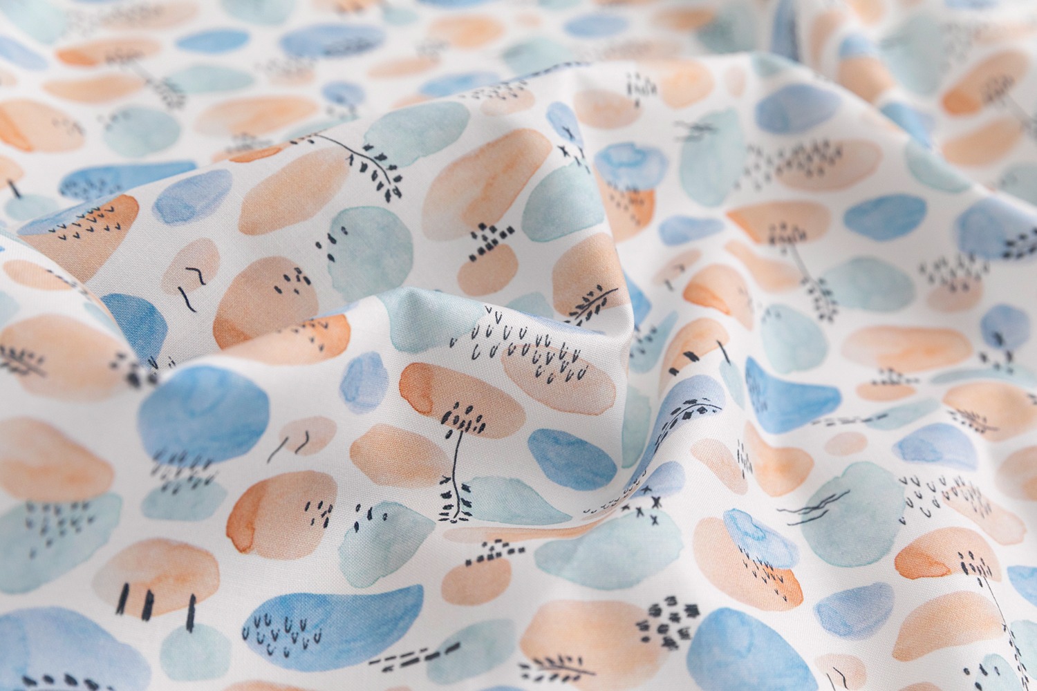 ホワイト地に、にじむようなブルーとアプリコットオレンジが重なり合い、