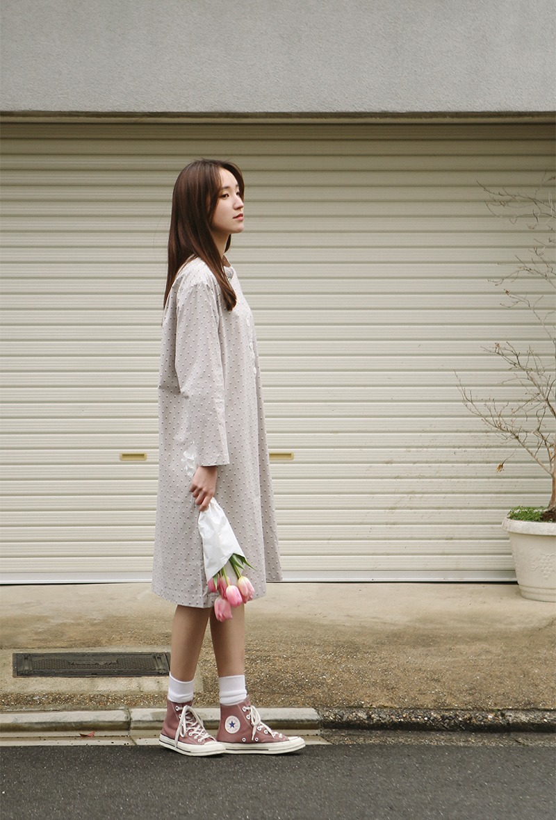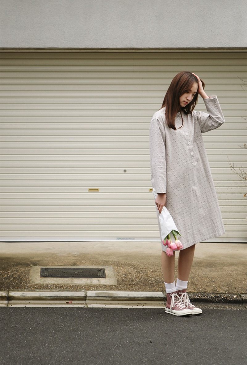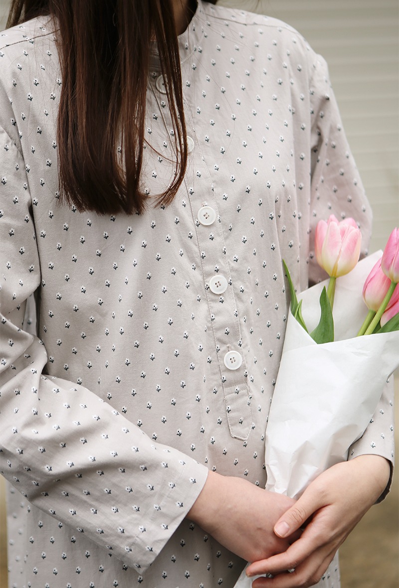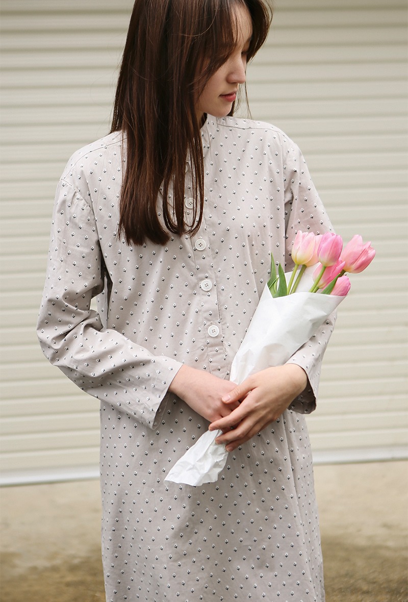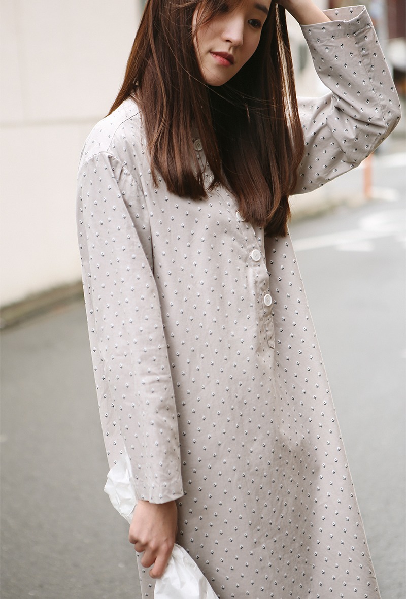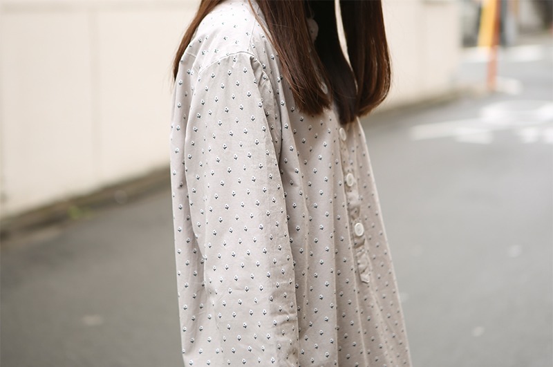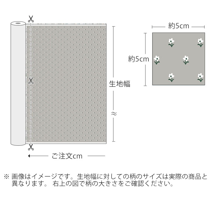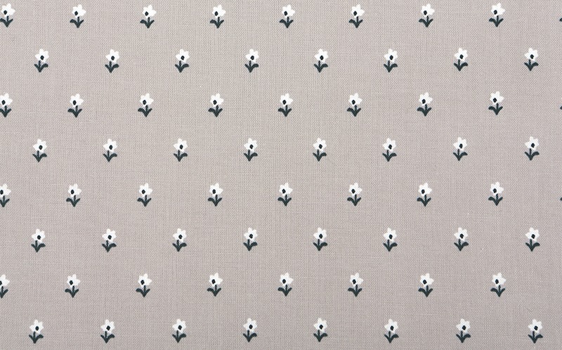 こちらの生地は「freebie(フリービー)」、グレージュ地に白い小花が並ぶコットン生地です。