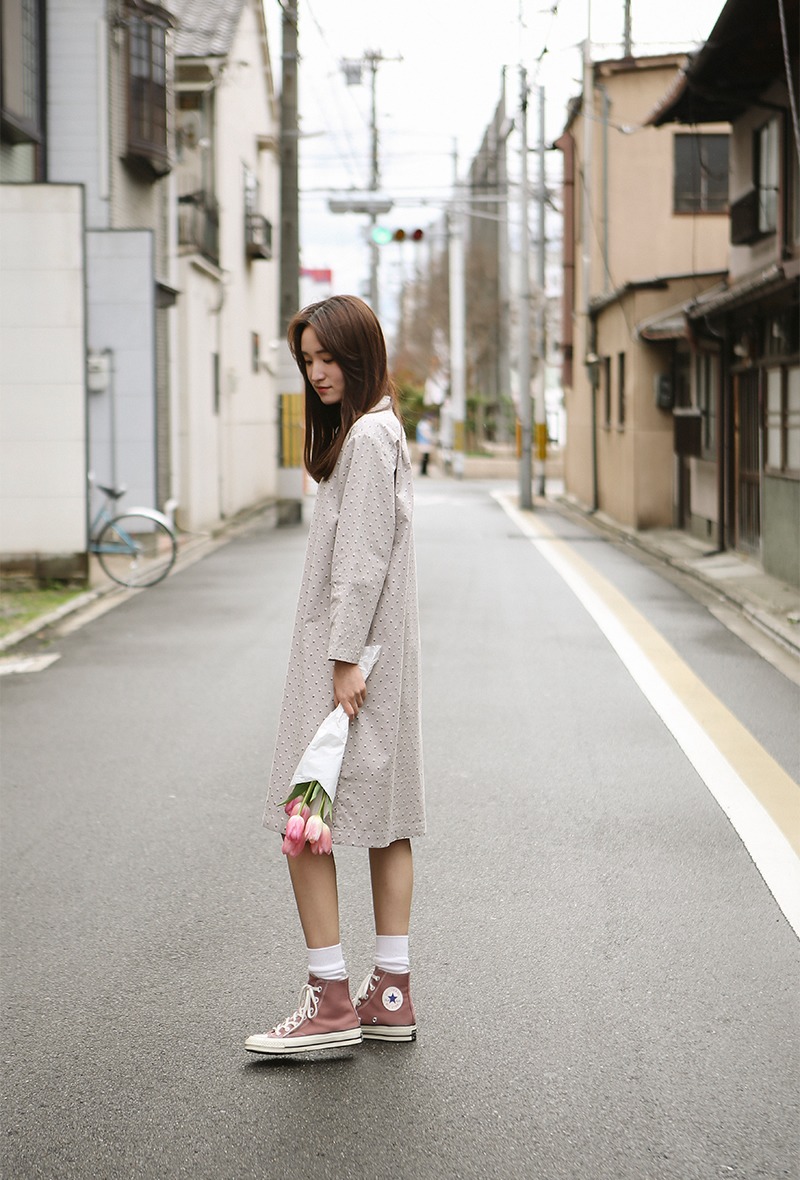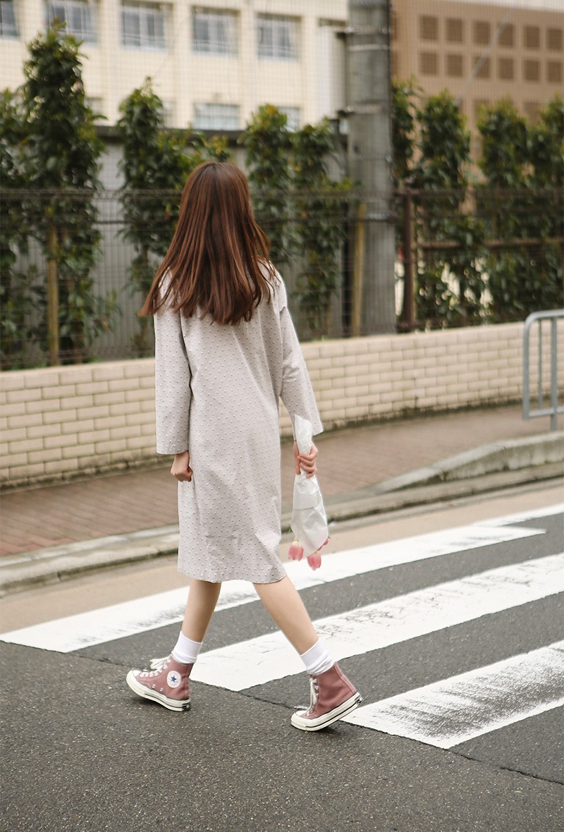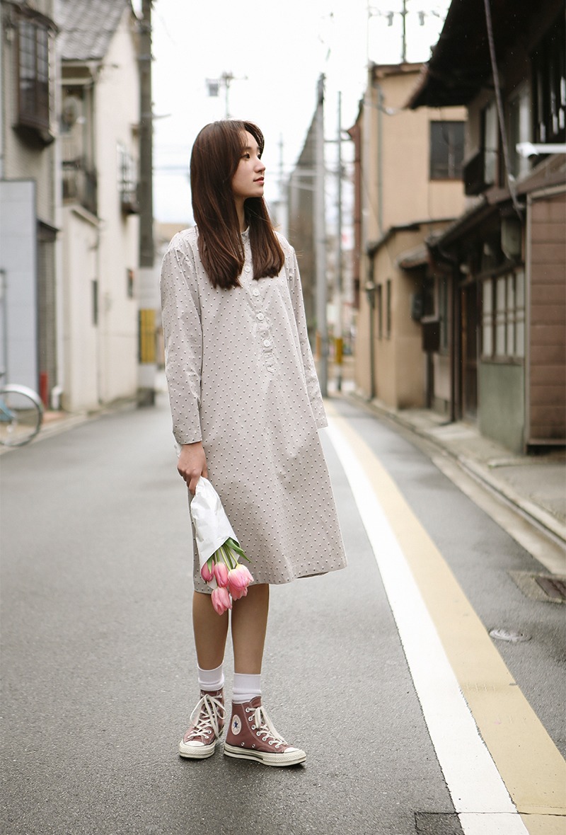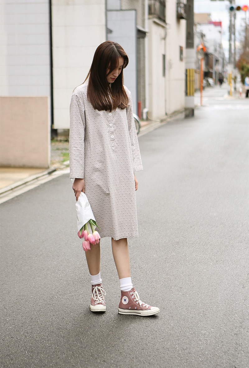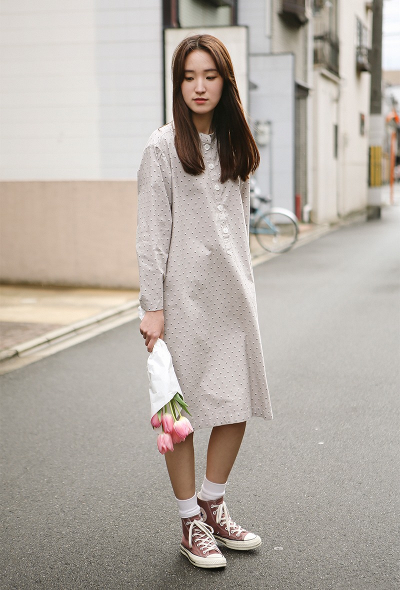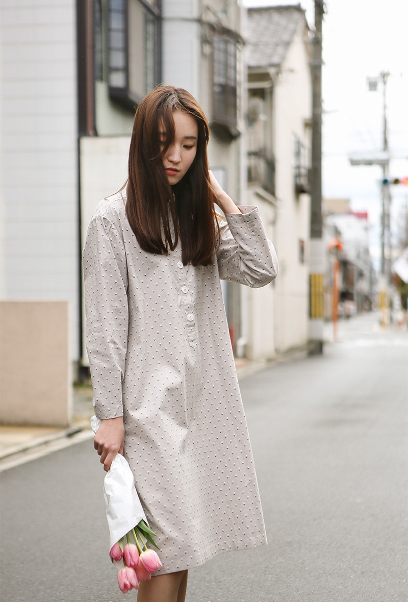 こちらの生地は「freebie(フリービー)」、グレージュ地に白い小花が並ぶコットン生地です。