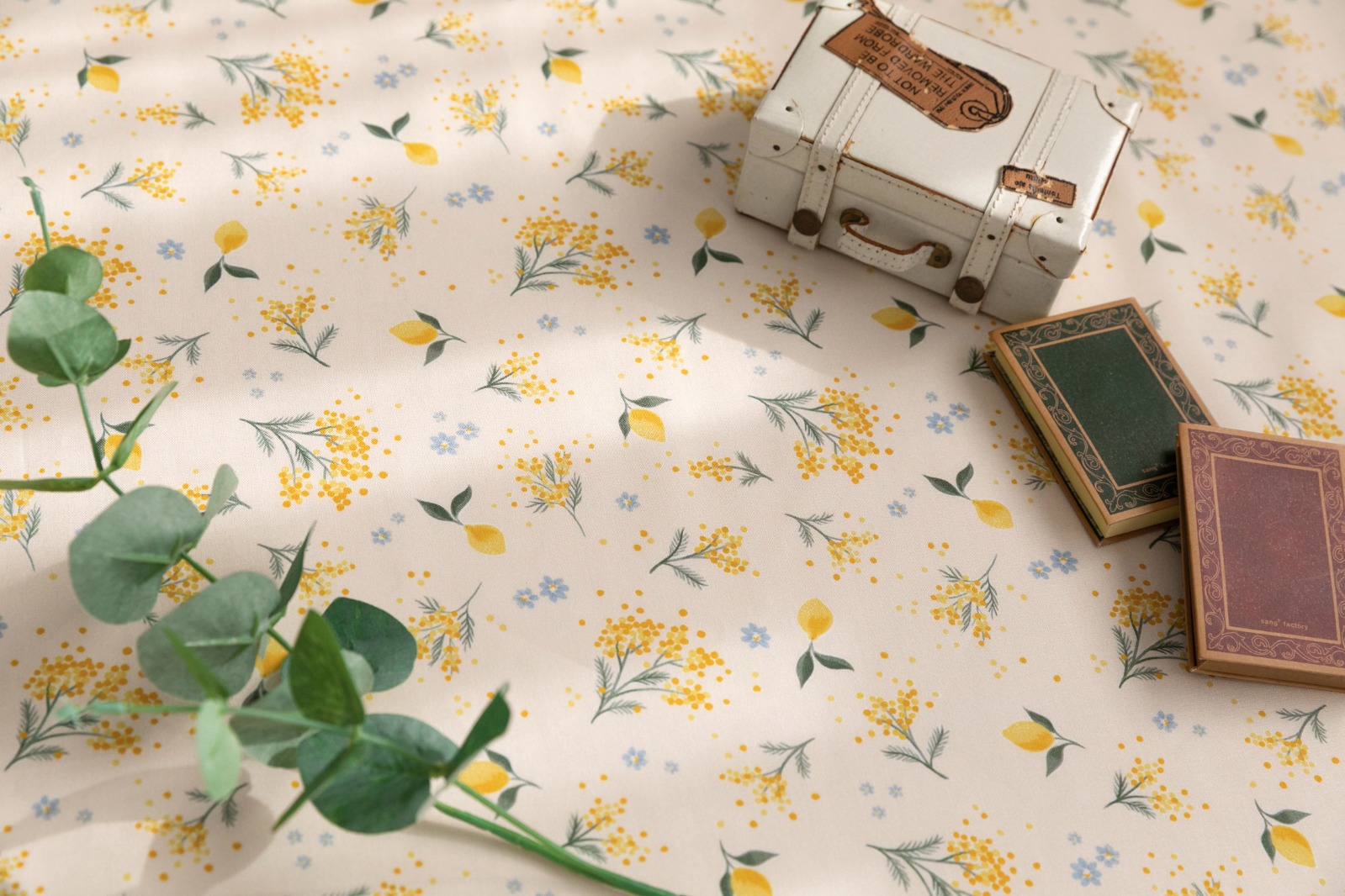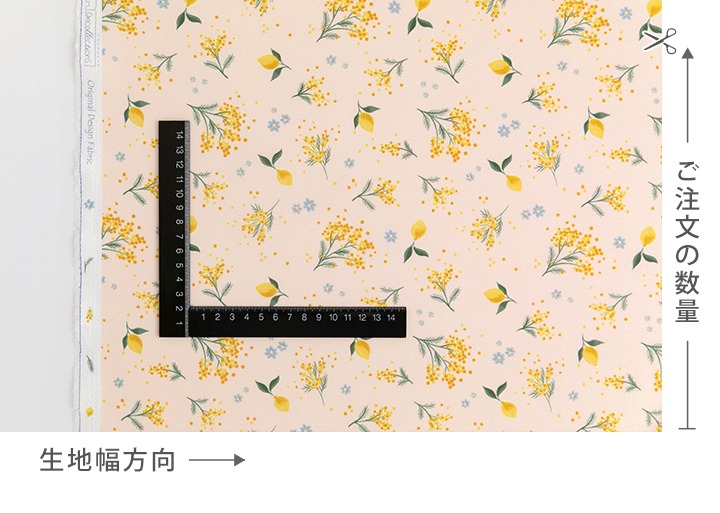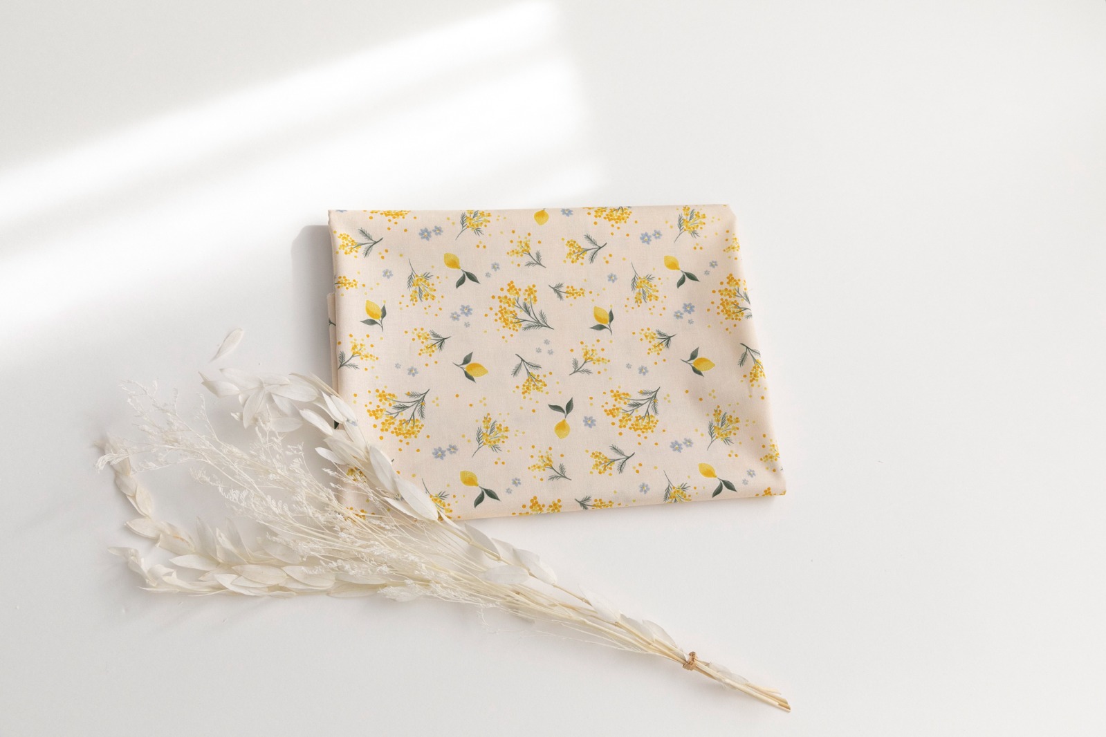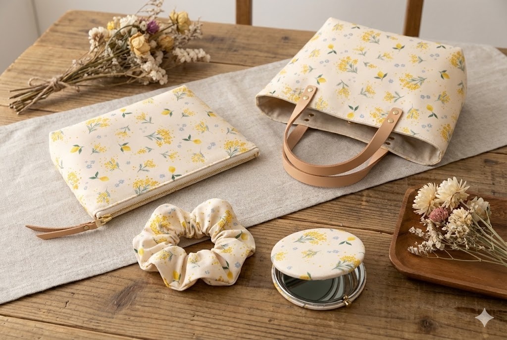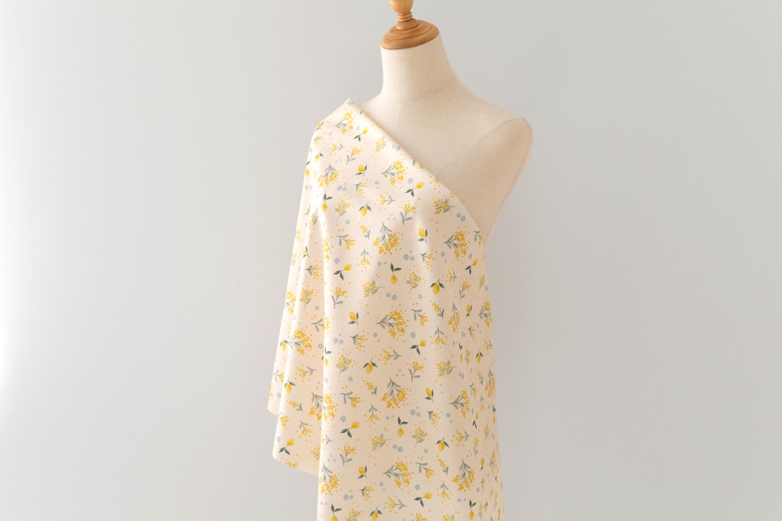 やわらかなクリームイエロー地に、ミモザの花がそっと咲く「ミモザの午後」。