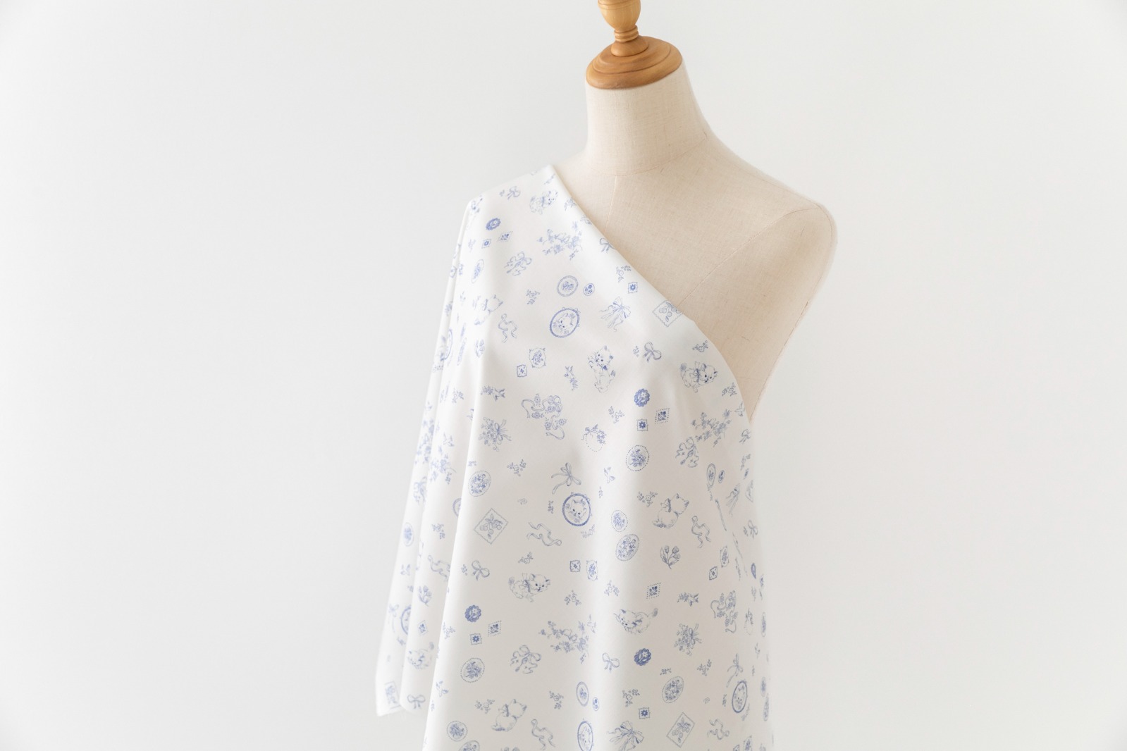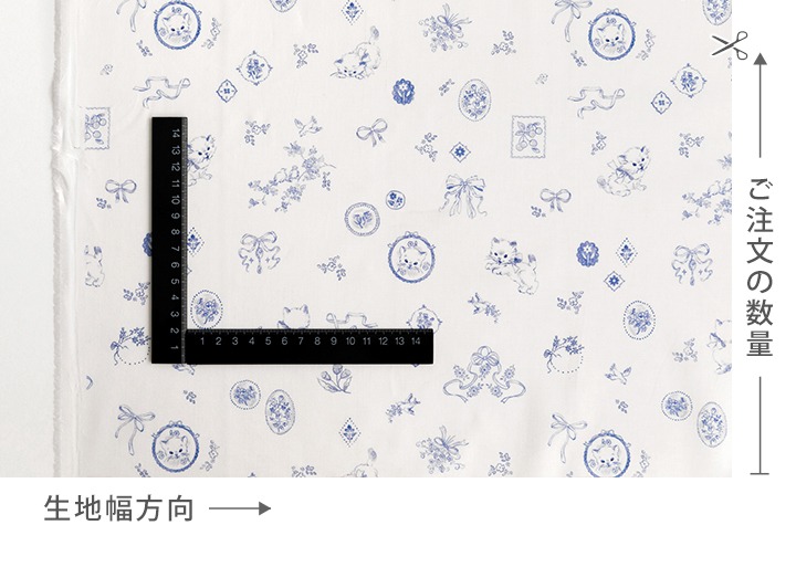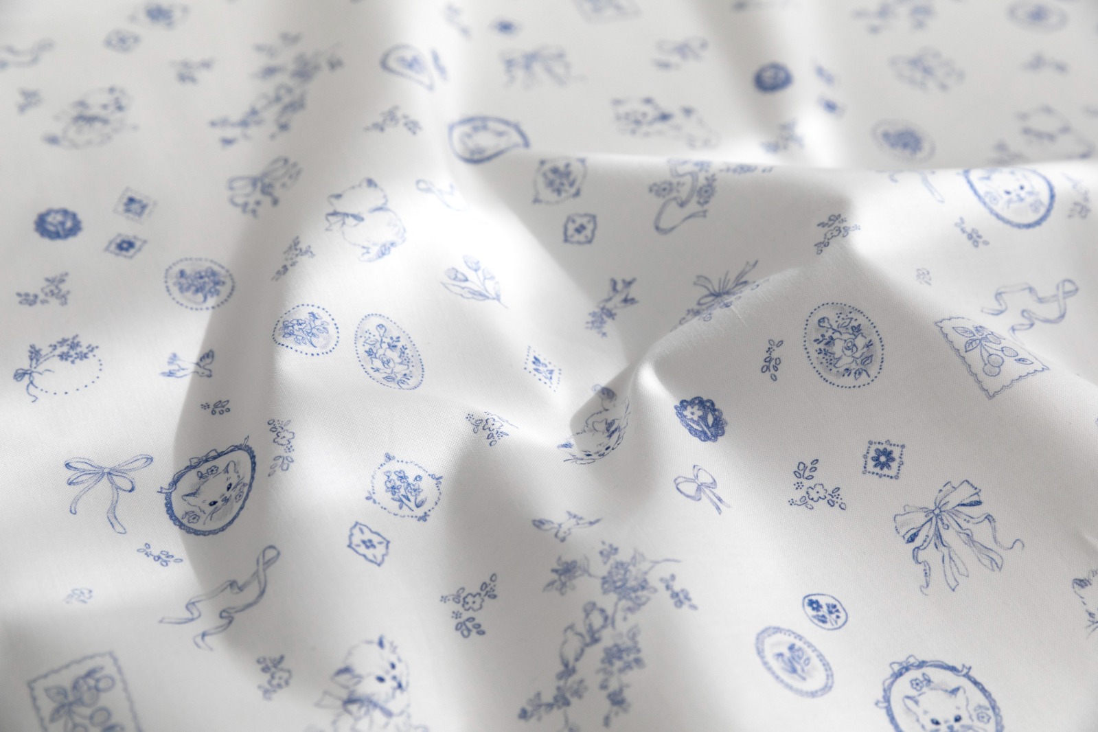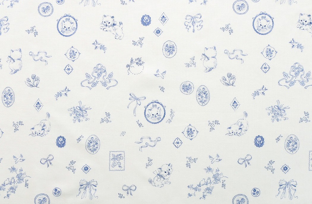 白地のやわらかな布に、インディゴブルーで描かれた小さな猫たち。