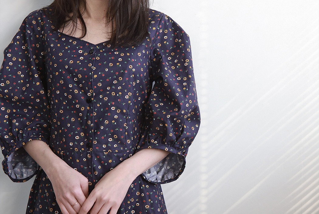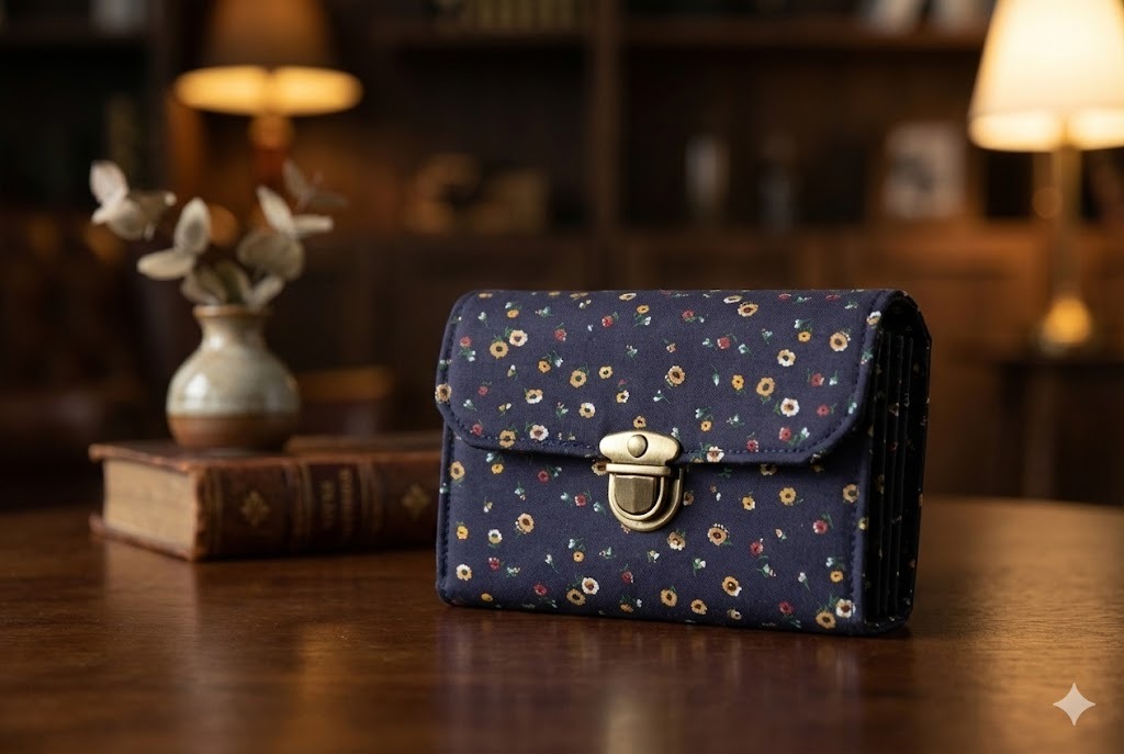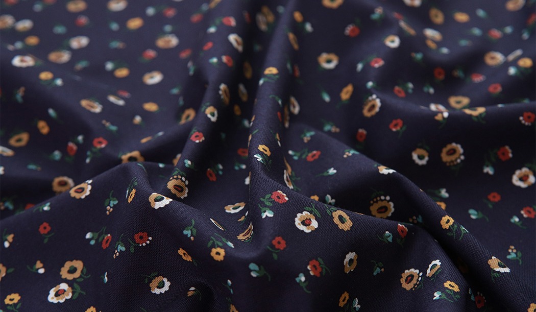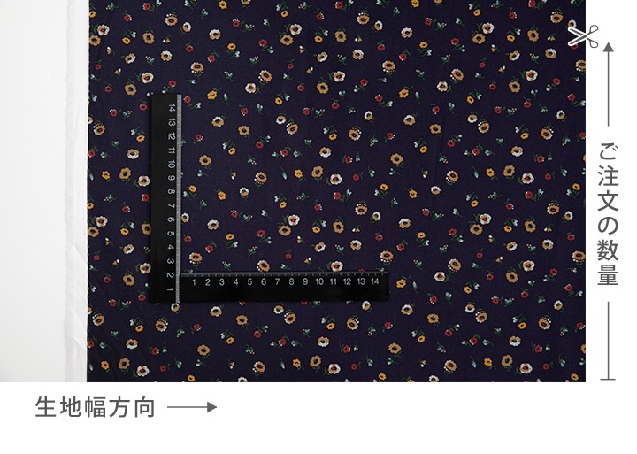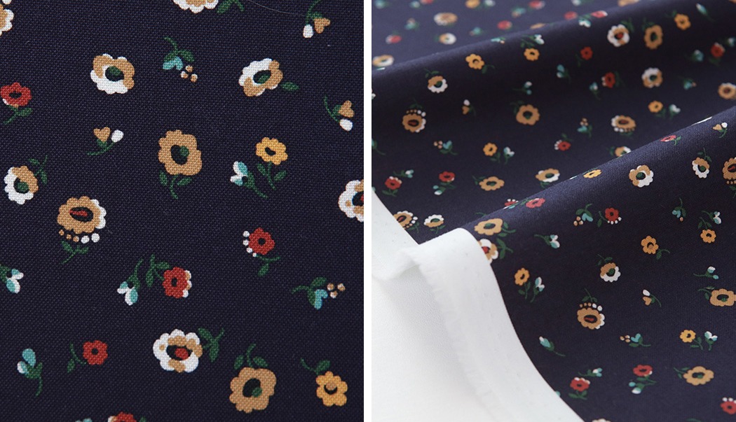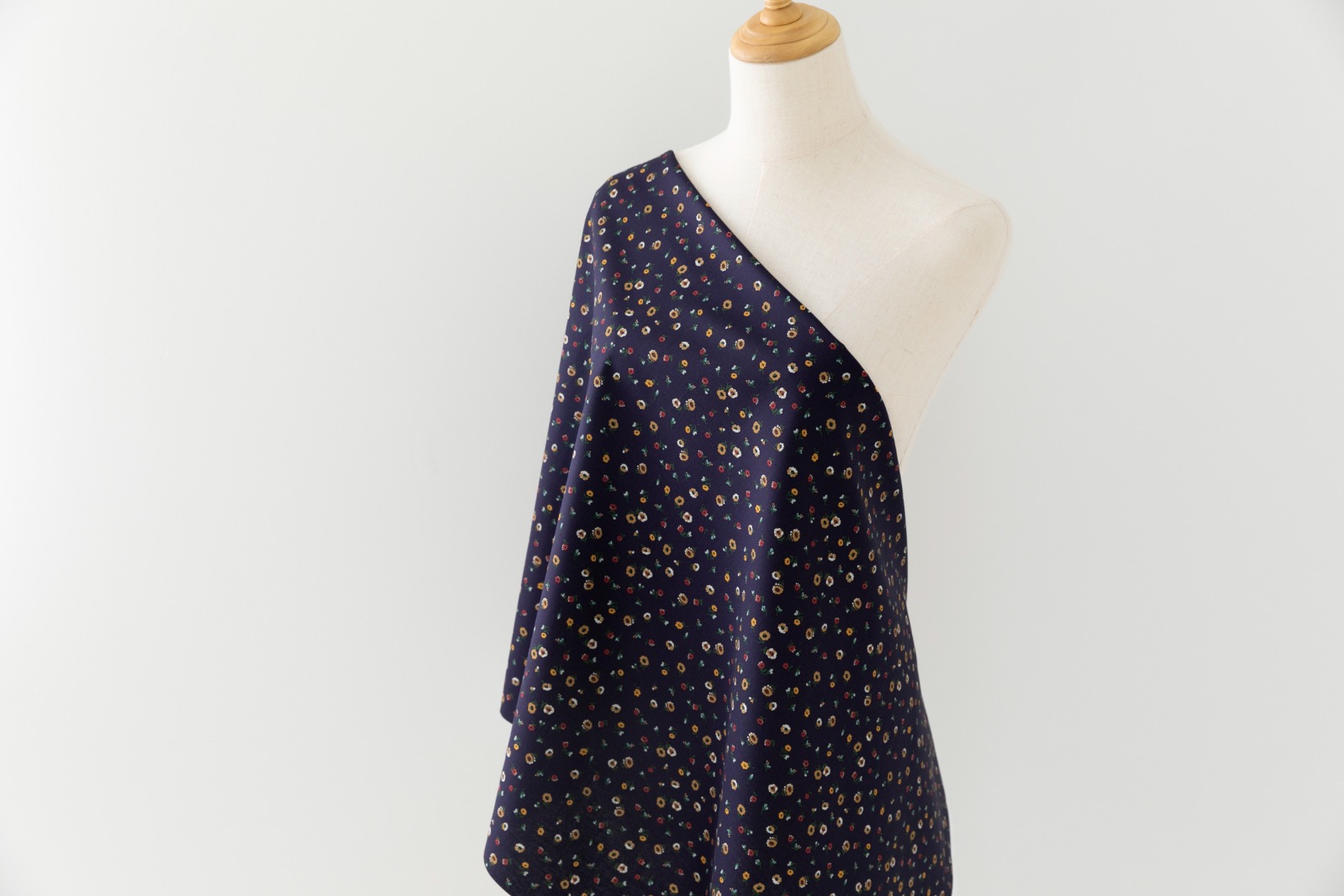 ネイビー寄りの深く濃いパープル地に、小さな花々が静かに浮かび上がります。