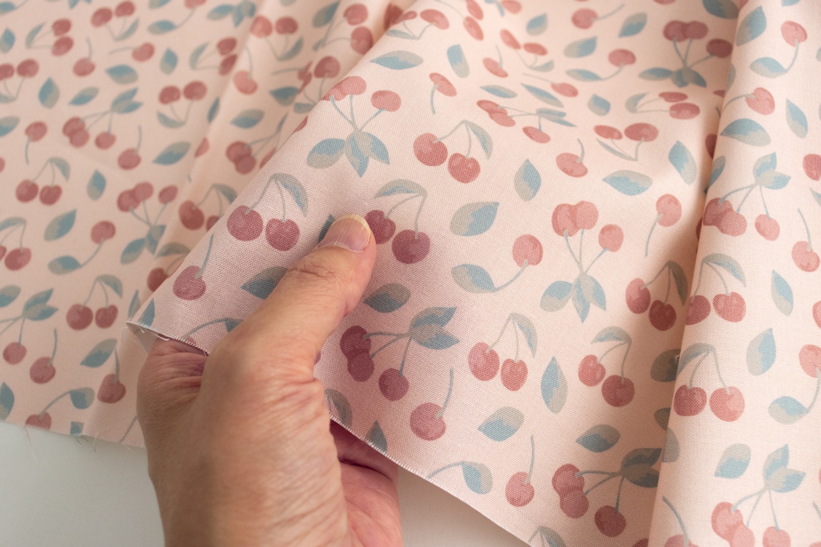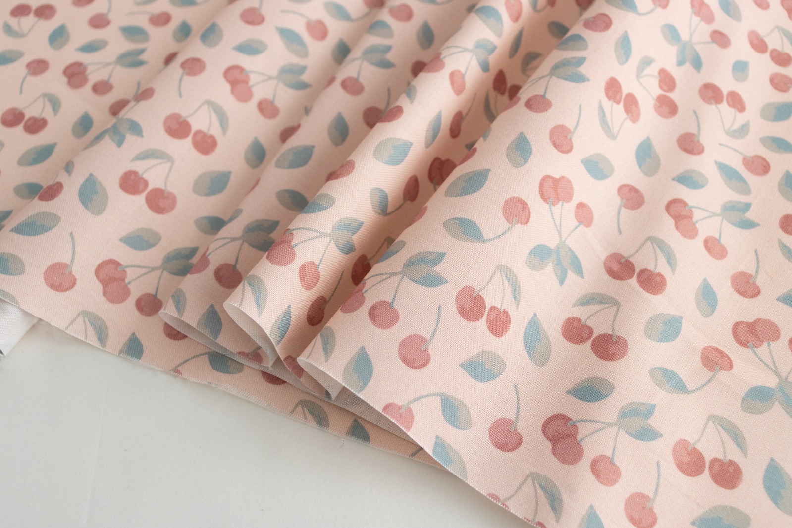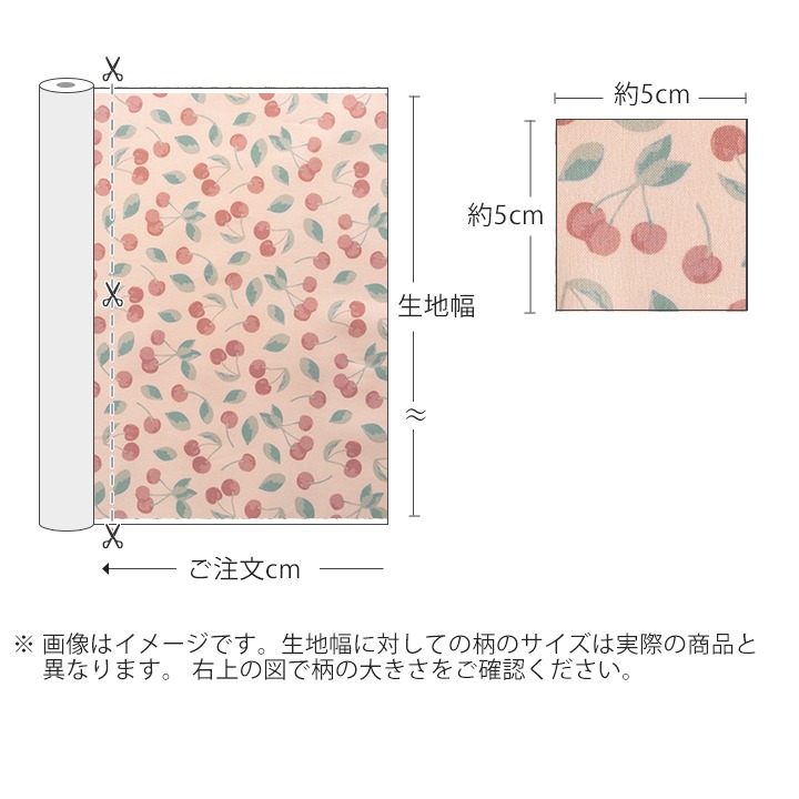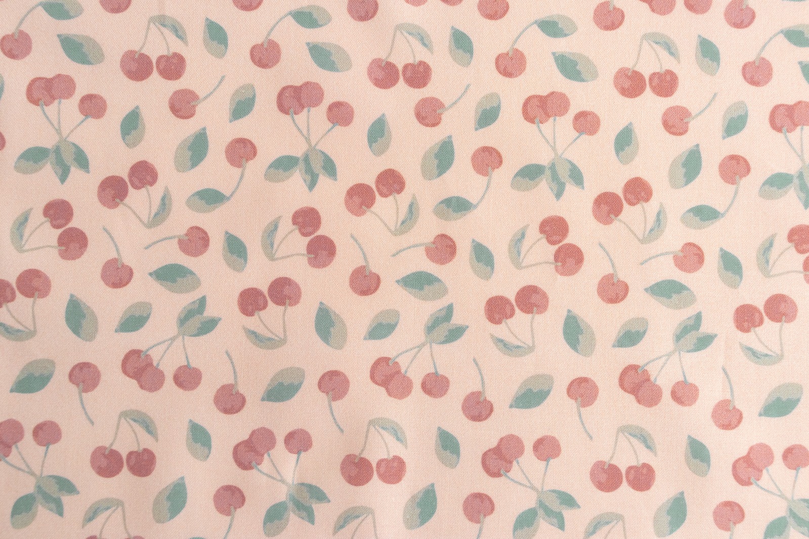 薄いサーモンピンク地に、落ち着いた色味でさくらんぼがたくさん描かれています。