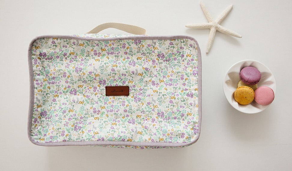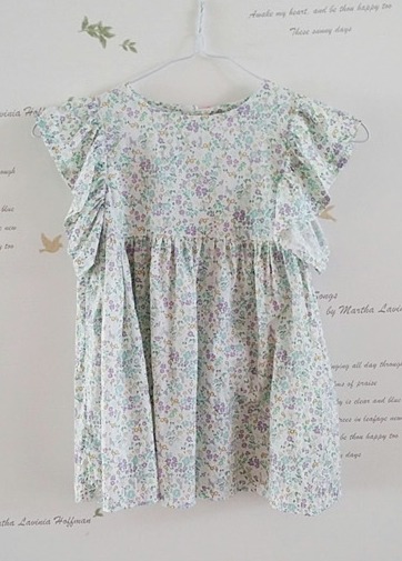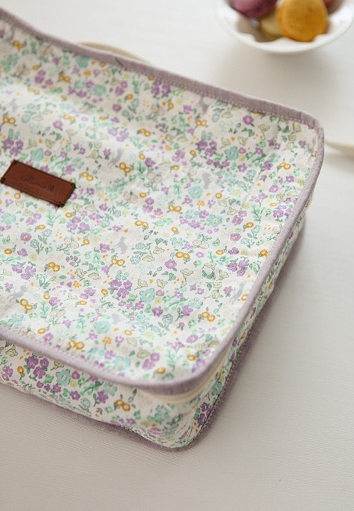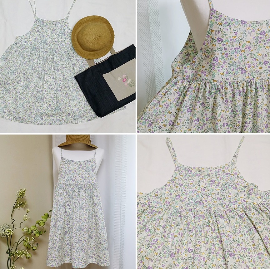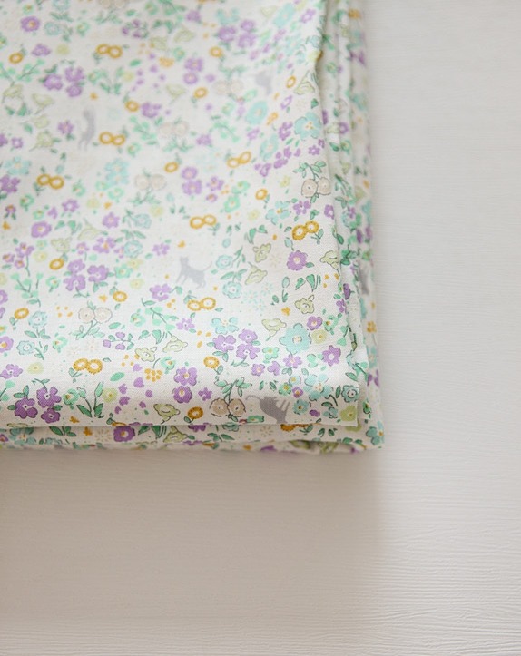 オフホワイト地に、ラベンダー色や水色、黄色の花々が一面に咲く中、