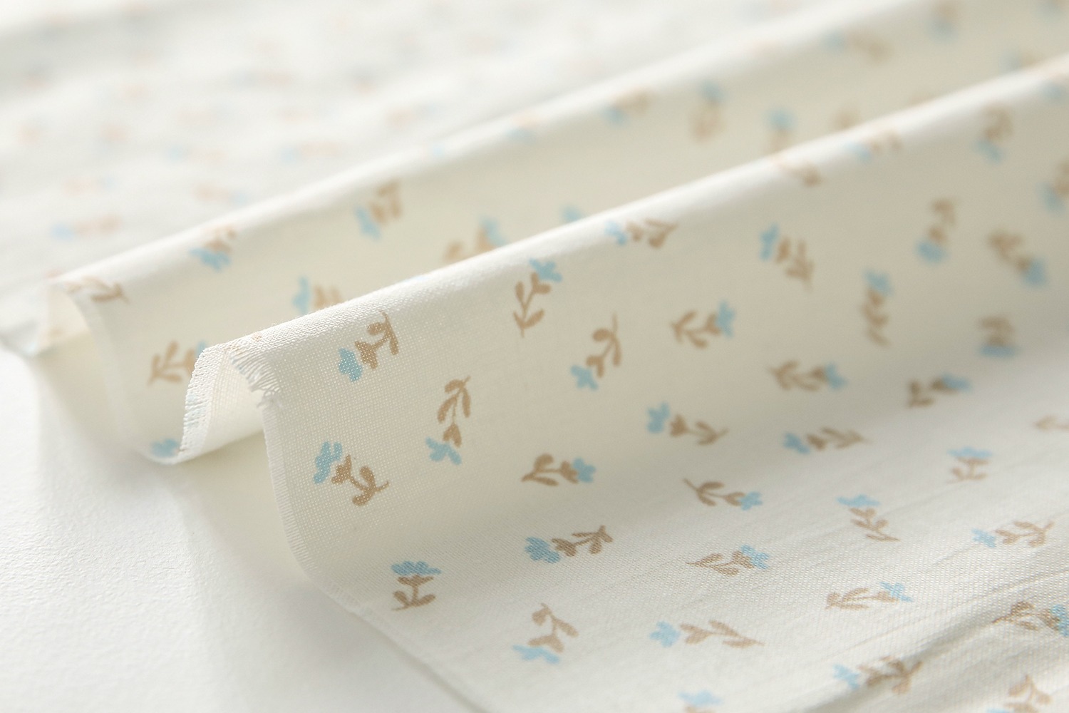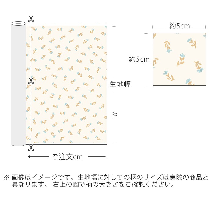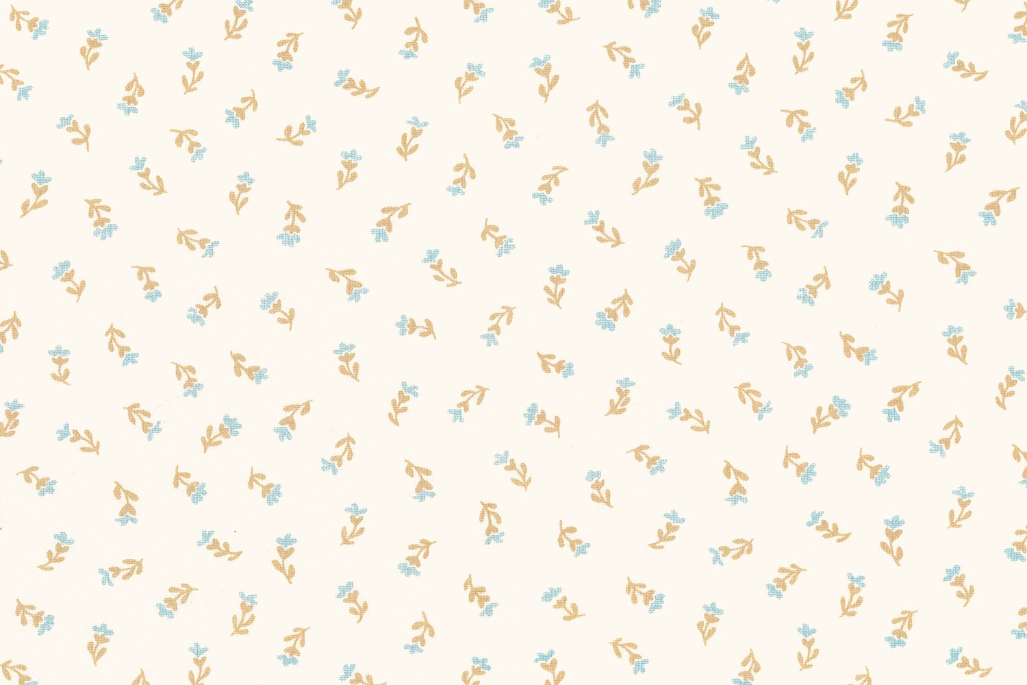 クリームがかったオフホワイト地に、ブラウンとミントブルーの小花が愛らしいコットン生地です。