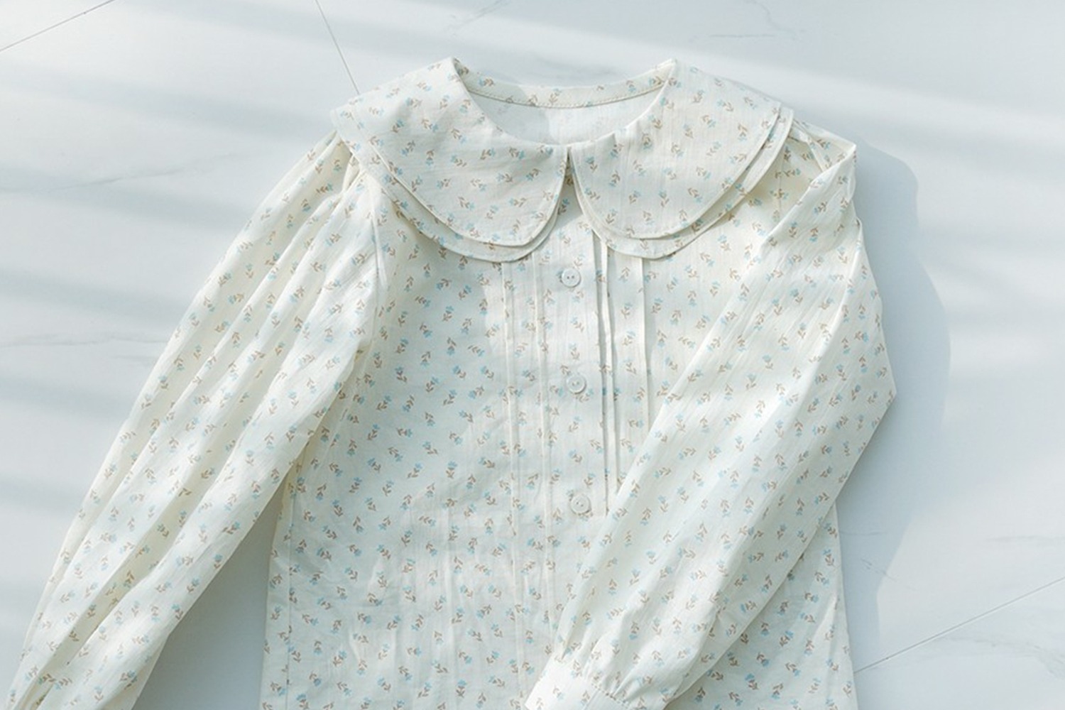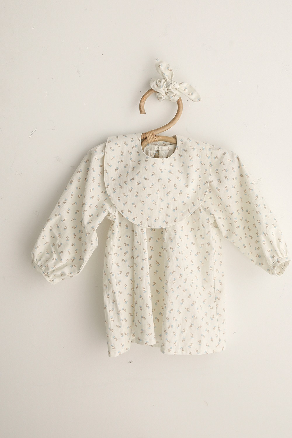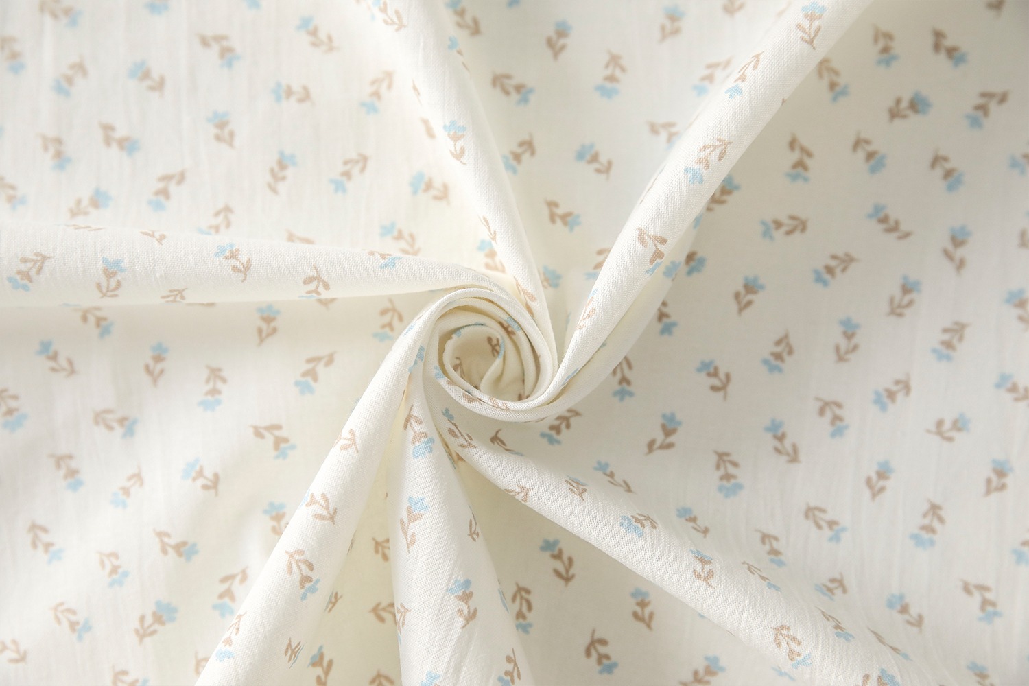 クリームがかったオフホワイト地に、ブラウンとミントブルーの小花が愛らしいコットン生地です。