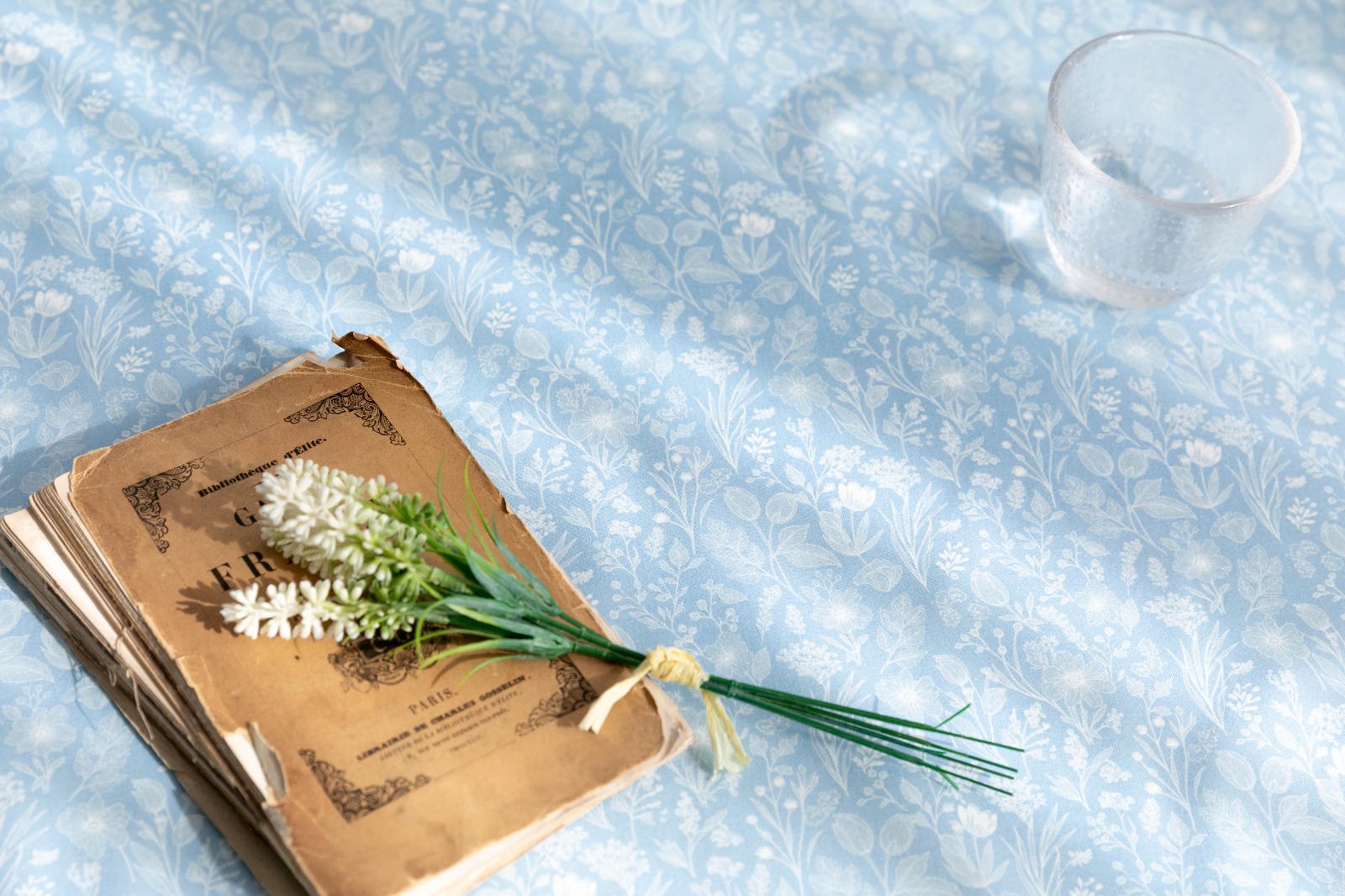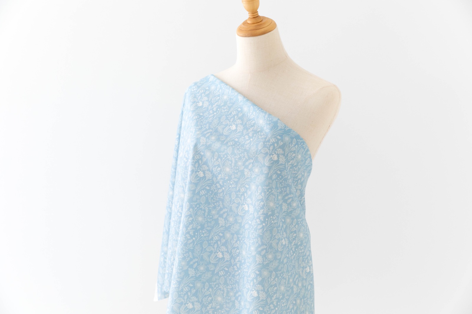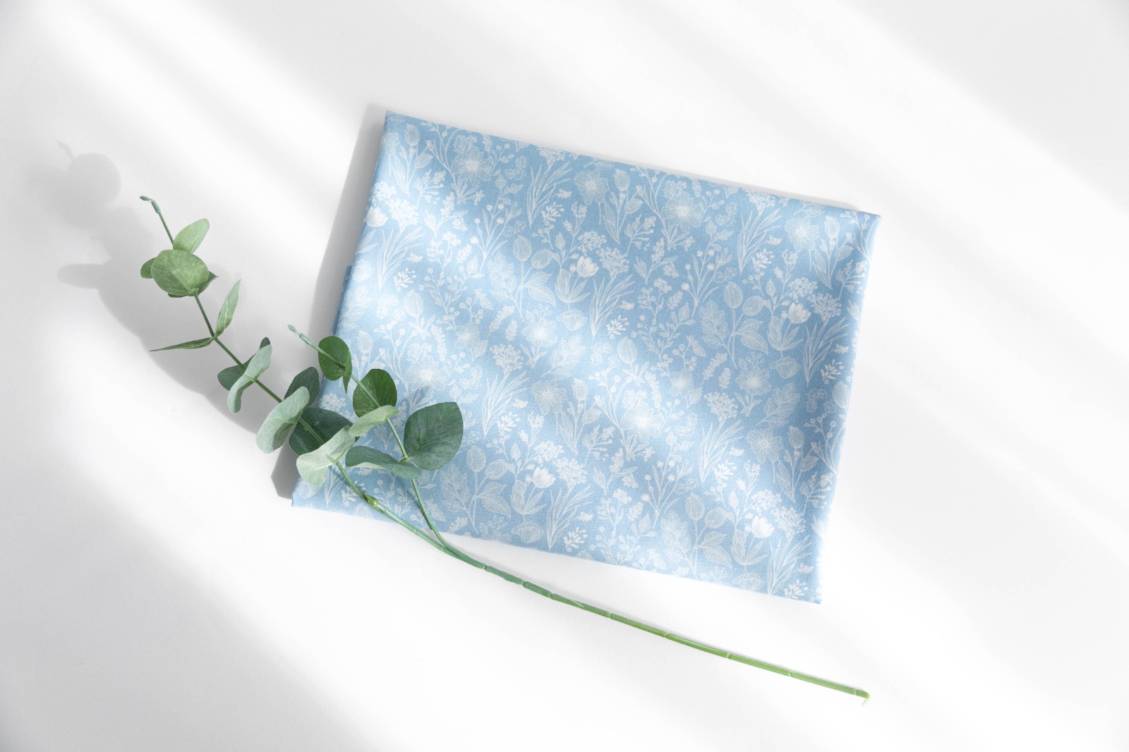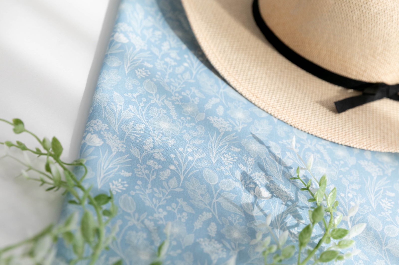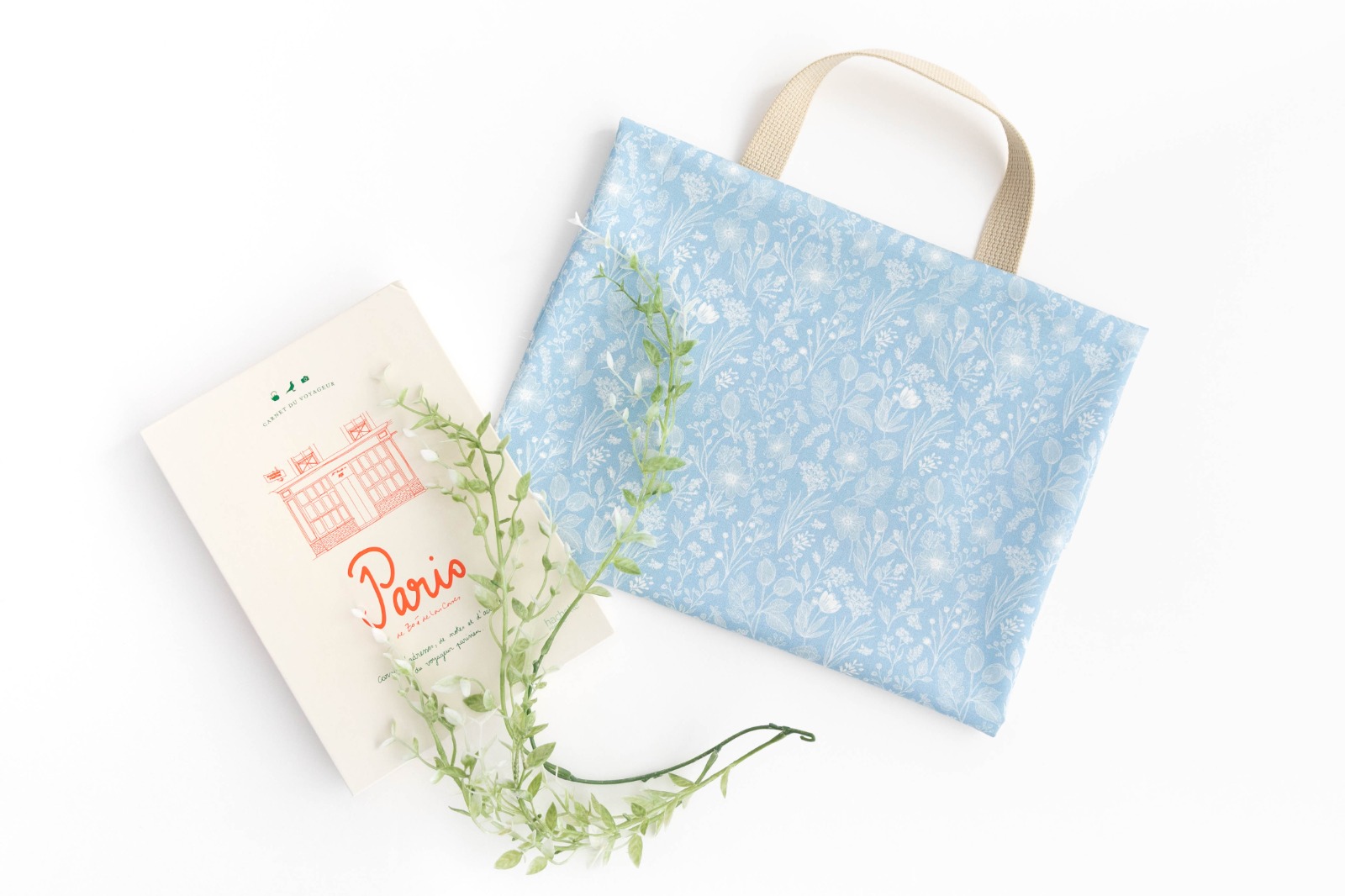 淡いブルーに、繊細な線で描かれた花や草木のボタニカルモチーフと