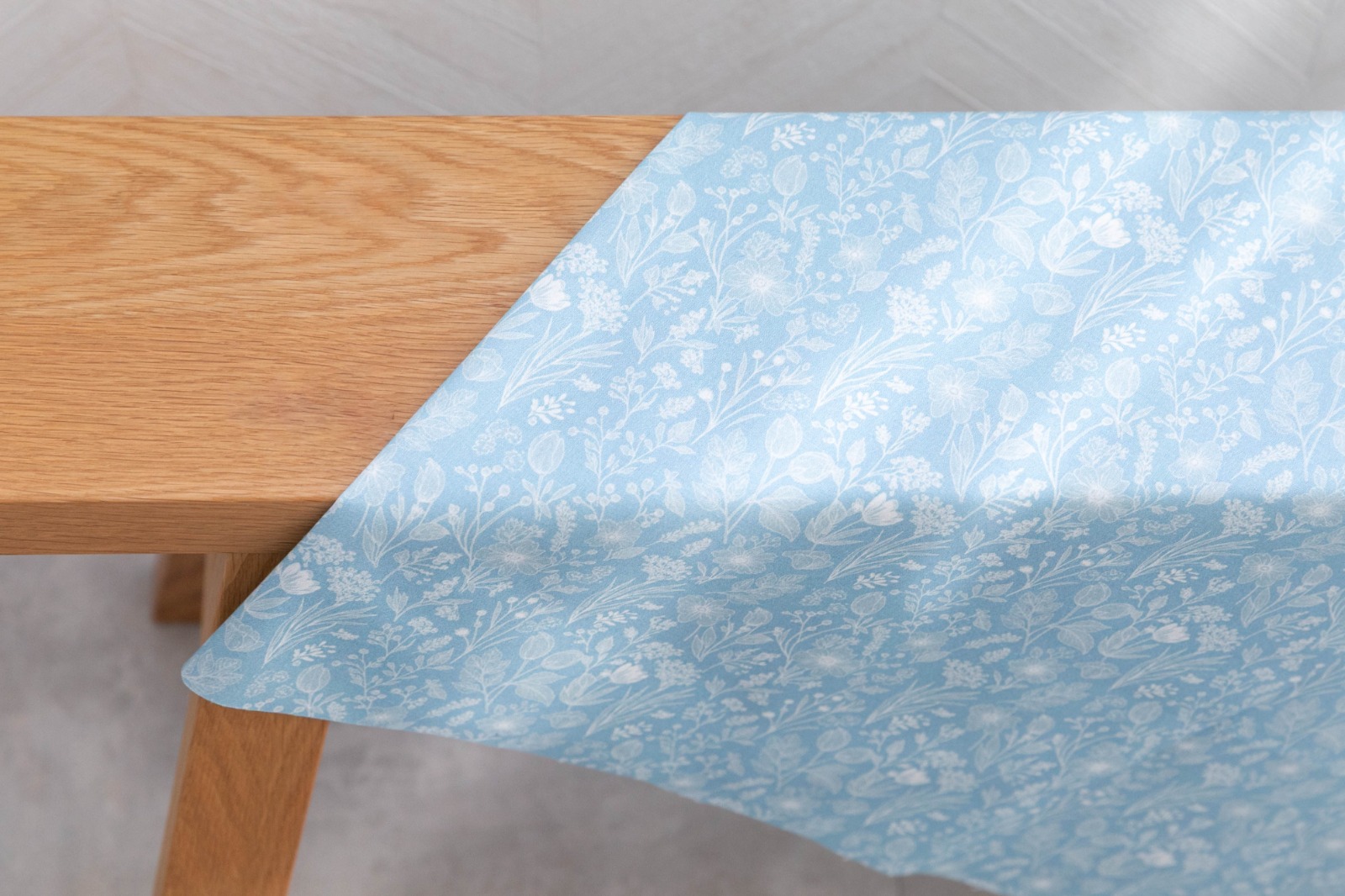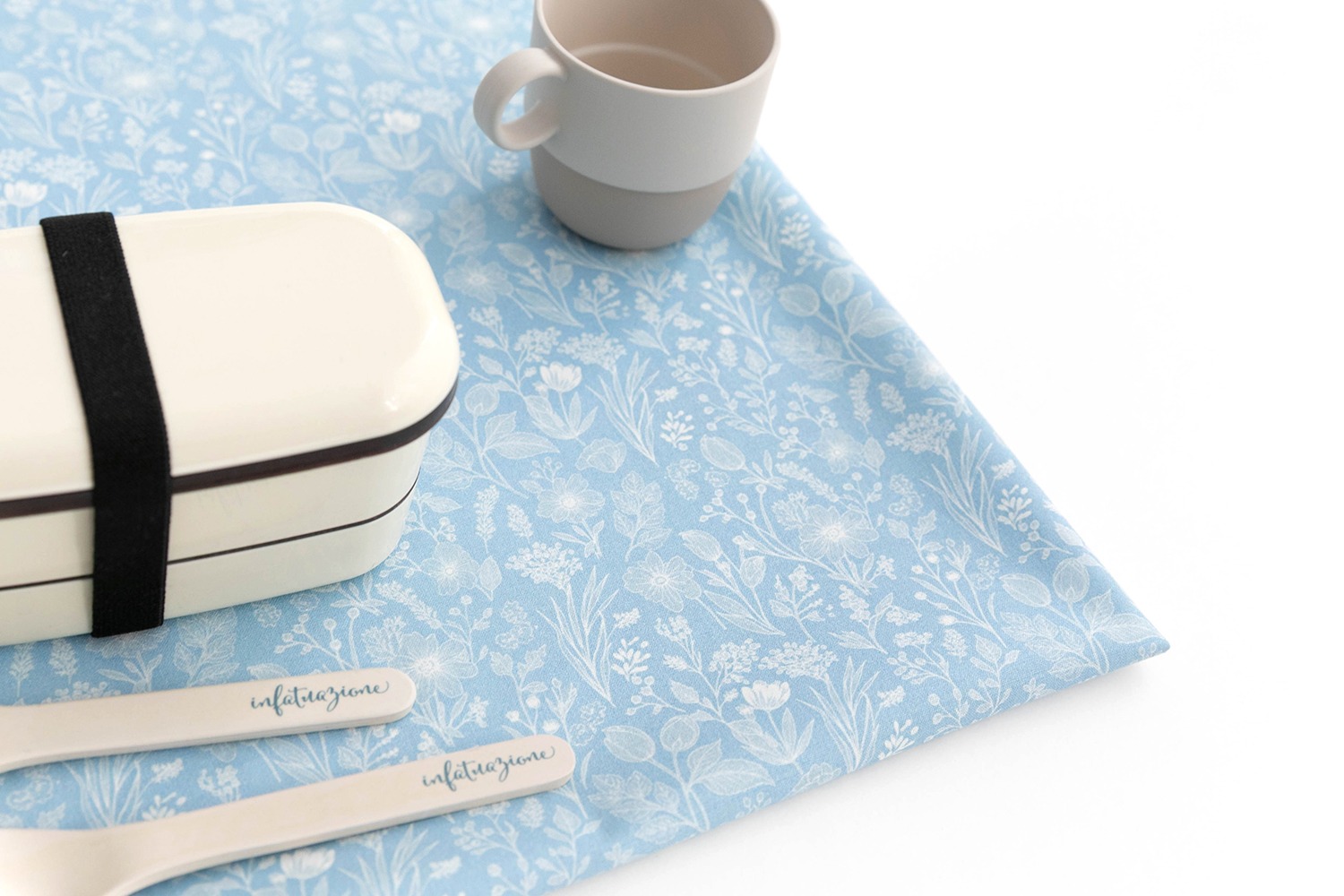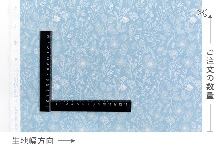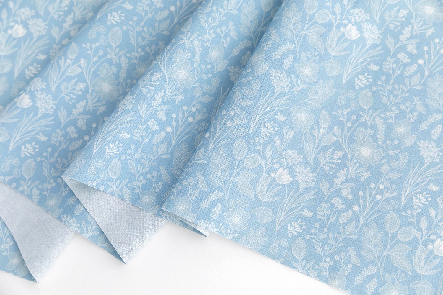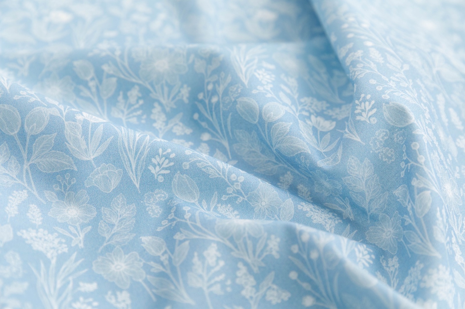 淡いブルーに、繊細な線で描かれた花や草木のボタニカルモチーフと