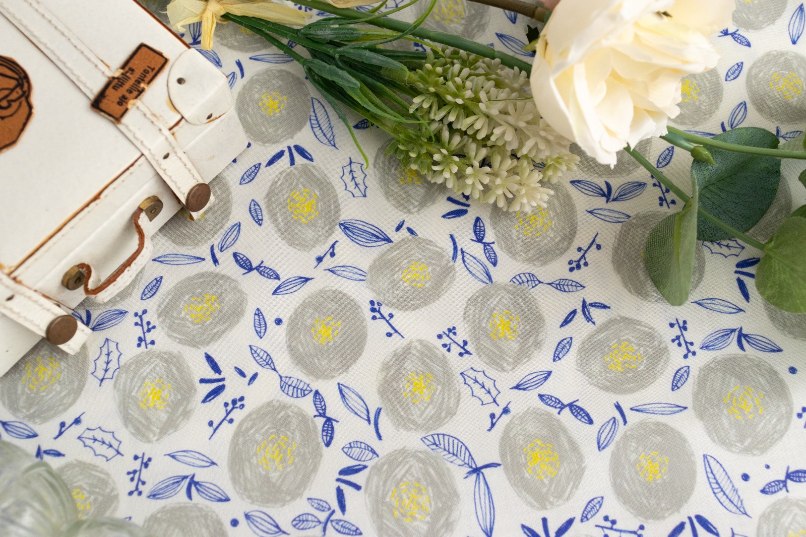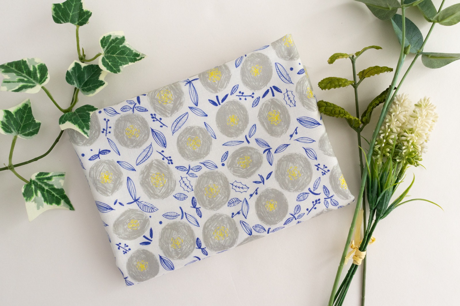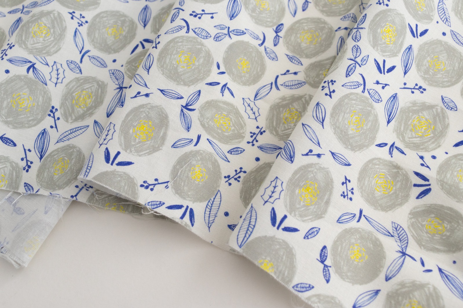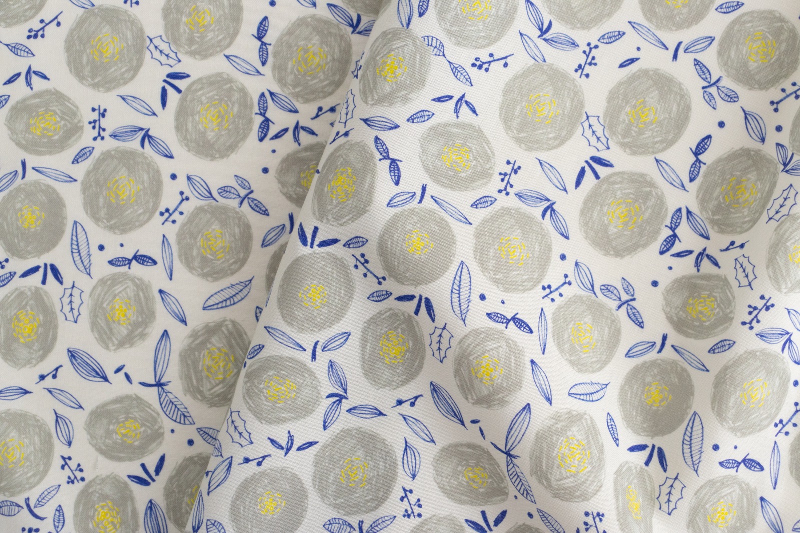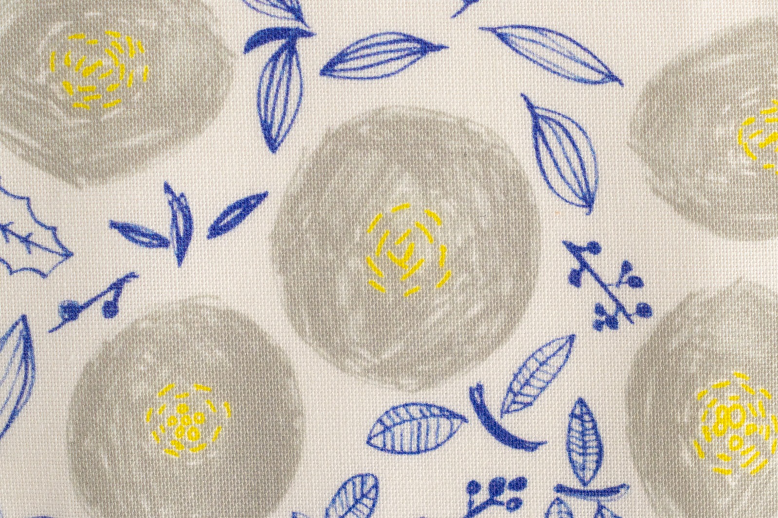 ホワイト地に、ウォームグレー・イエロー・ライトネイビーでラフに描かれた丸い花が一面に並んでいます。