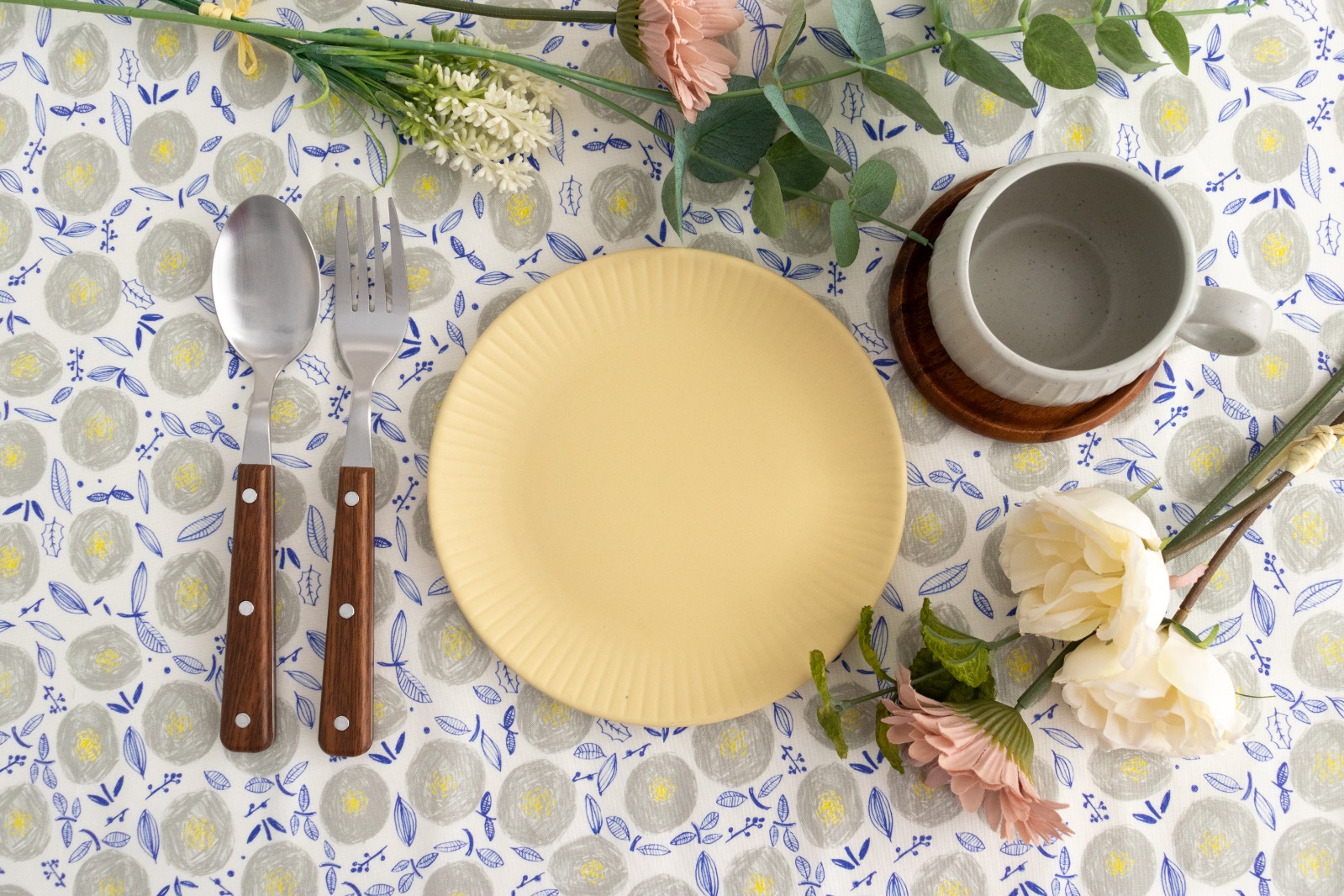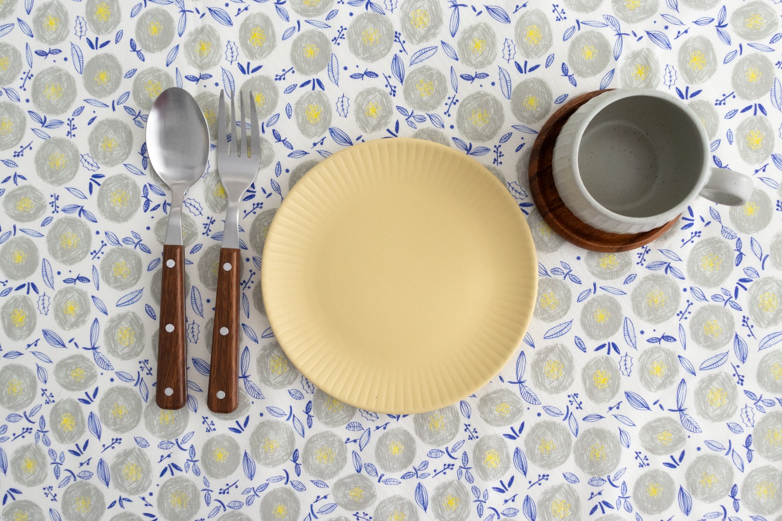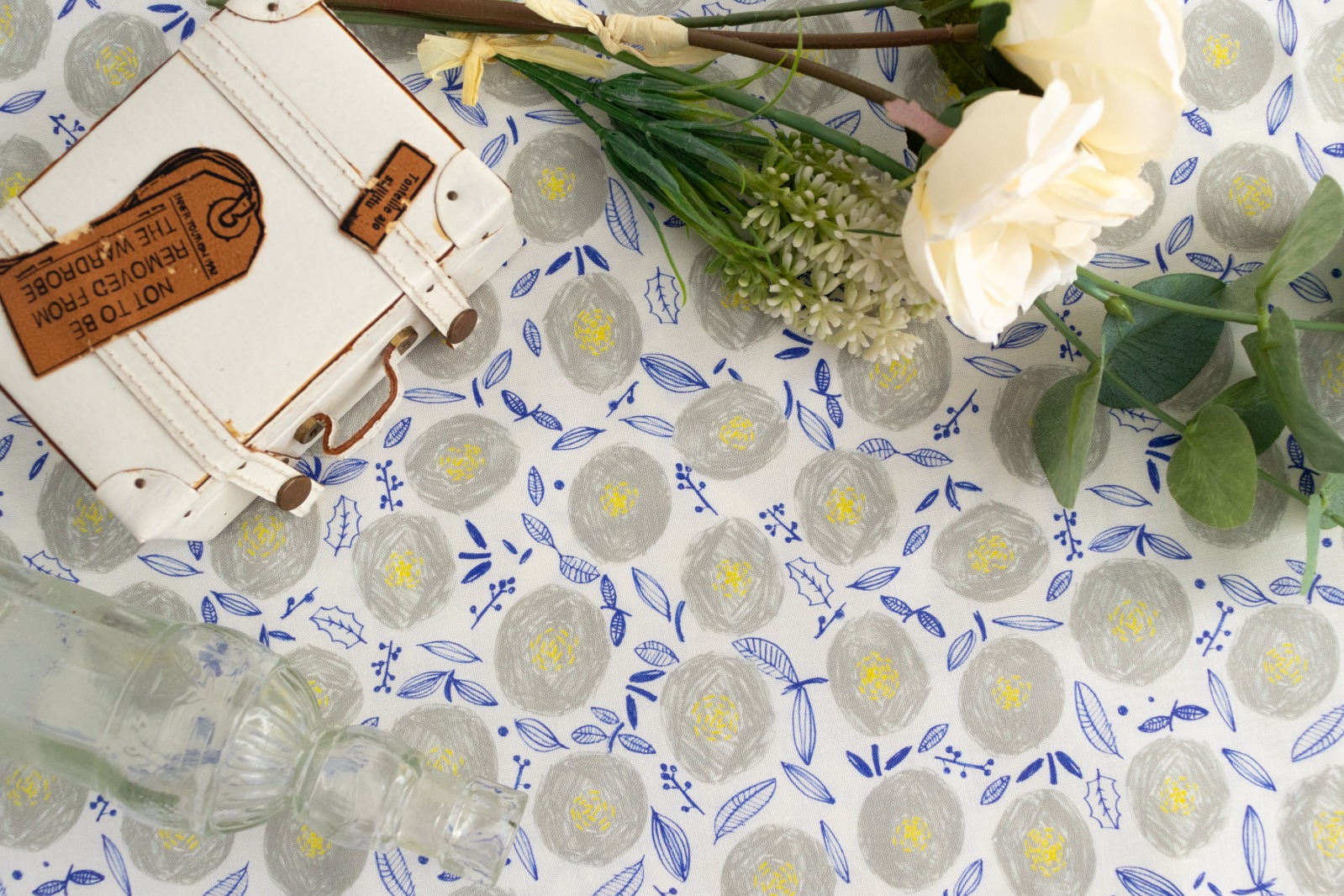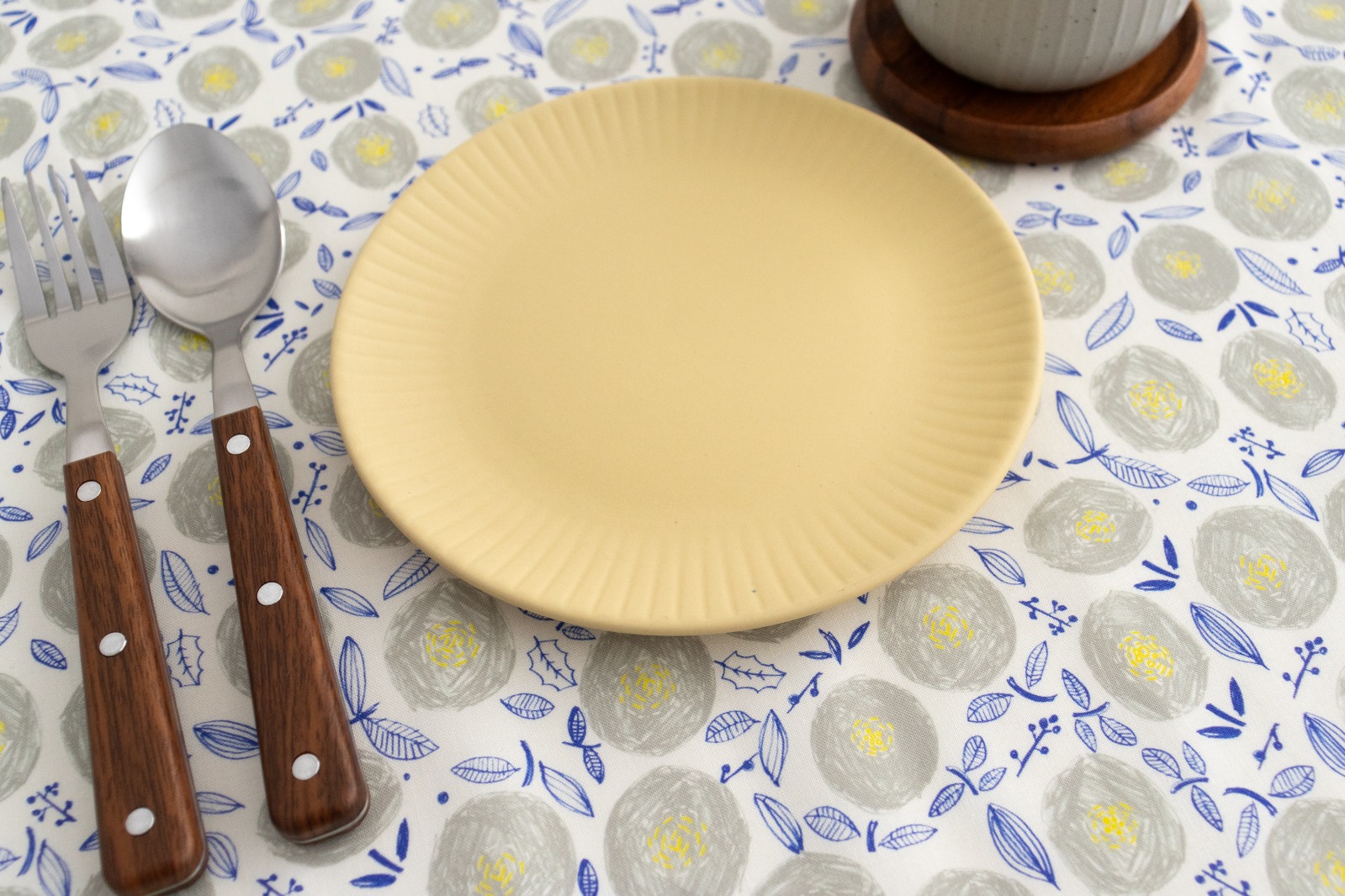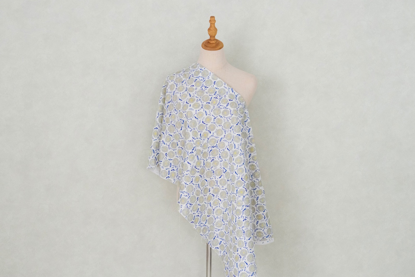 ホワイト地に、ウォームグレー・イエロー・ライトネイビーでラフに描かれた丸い花が一面に並んでいます。
