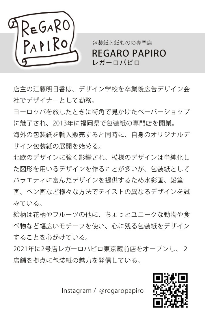 こちらは、包装紙と紙ものの専門店「REGARO PAPIRO(レガーロパピロ)」とデコレクションズのコラボ生地です。