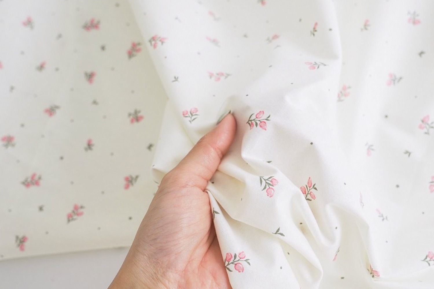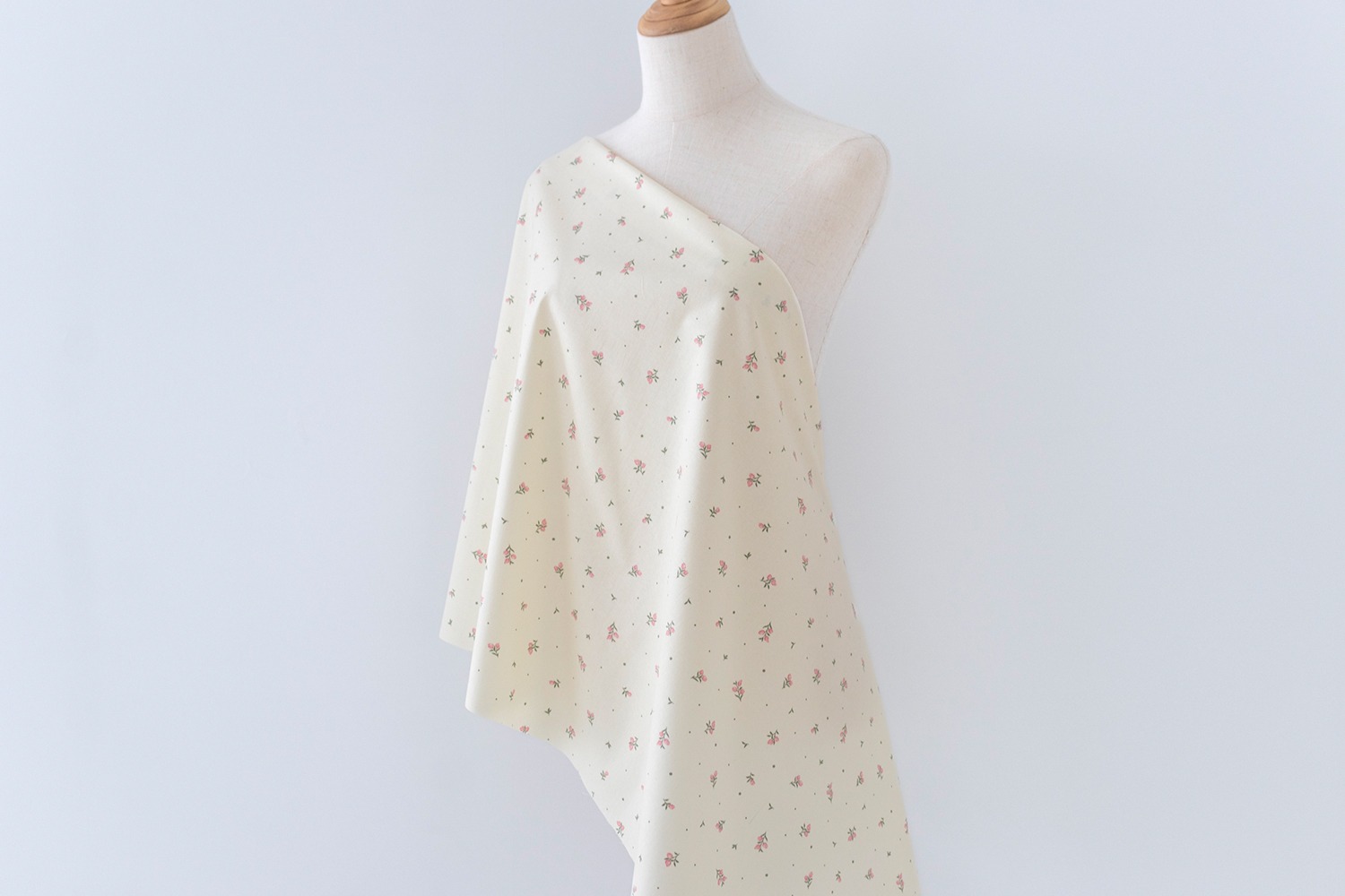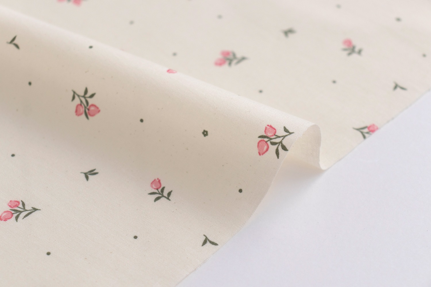 アイボリー地に、ピンクの花と葉が一面に描かれた優しい印象のコットン生地です。