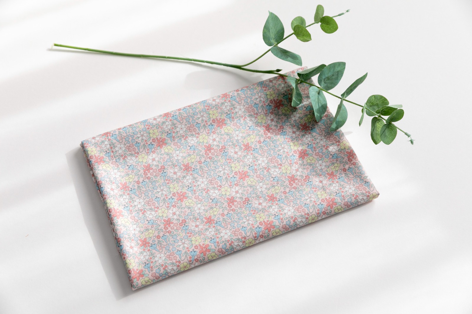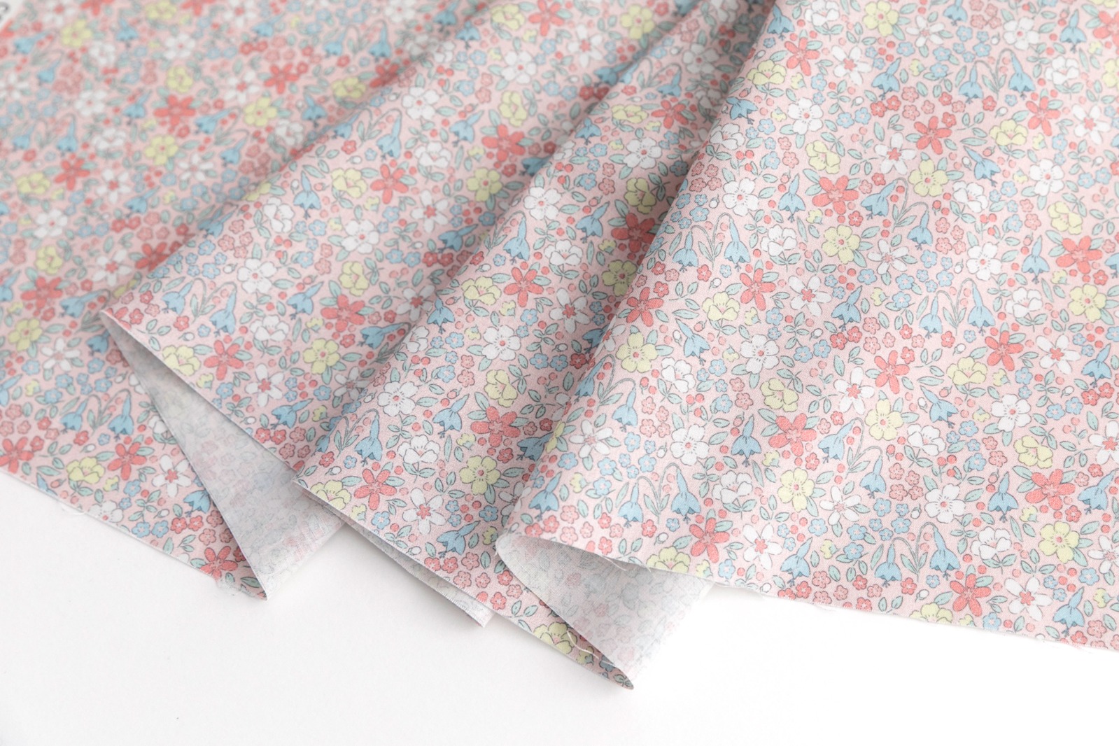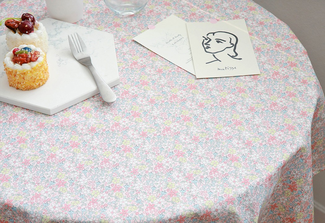 ピンク、ブルー、イエローのパステルカラーがふんわりと重なり、優しい雰囲気をまとっています。