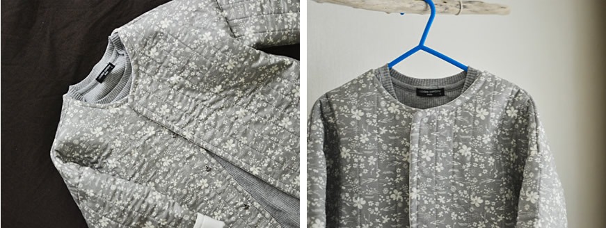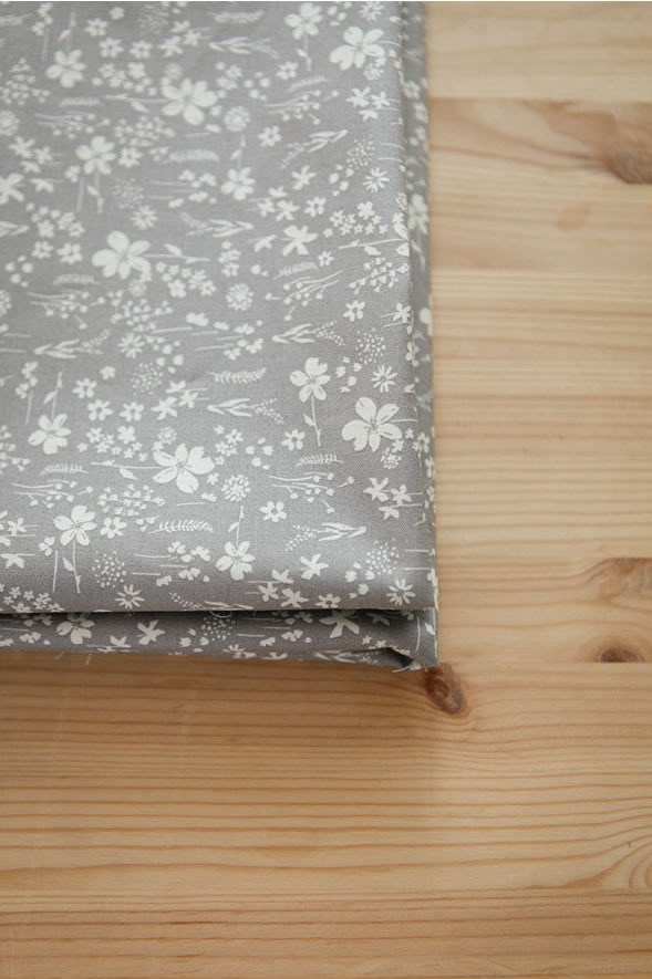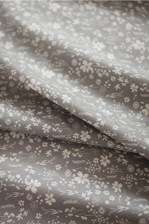 落ち着いたグレー地に色々な種類の草花が白抜きで表現されたコットン生地です。