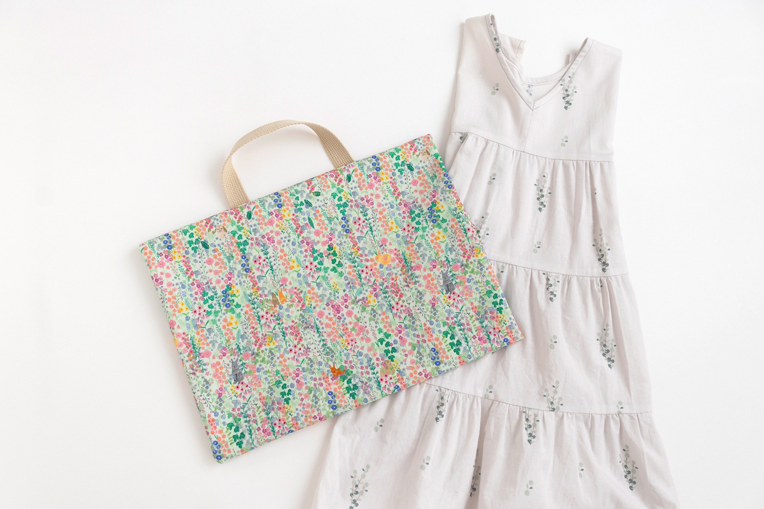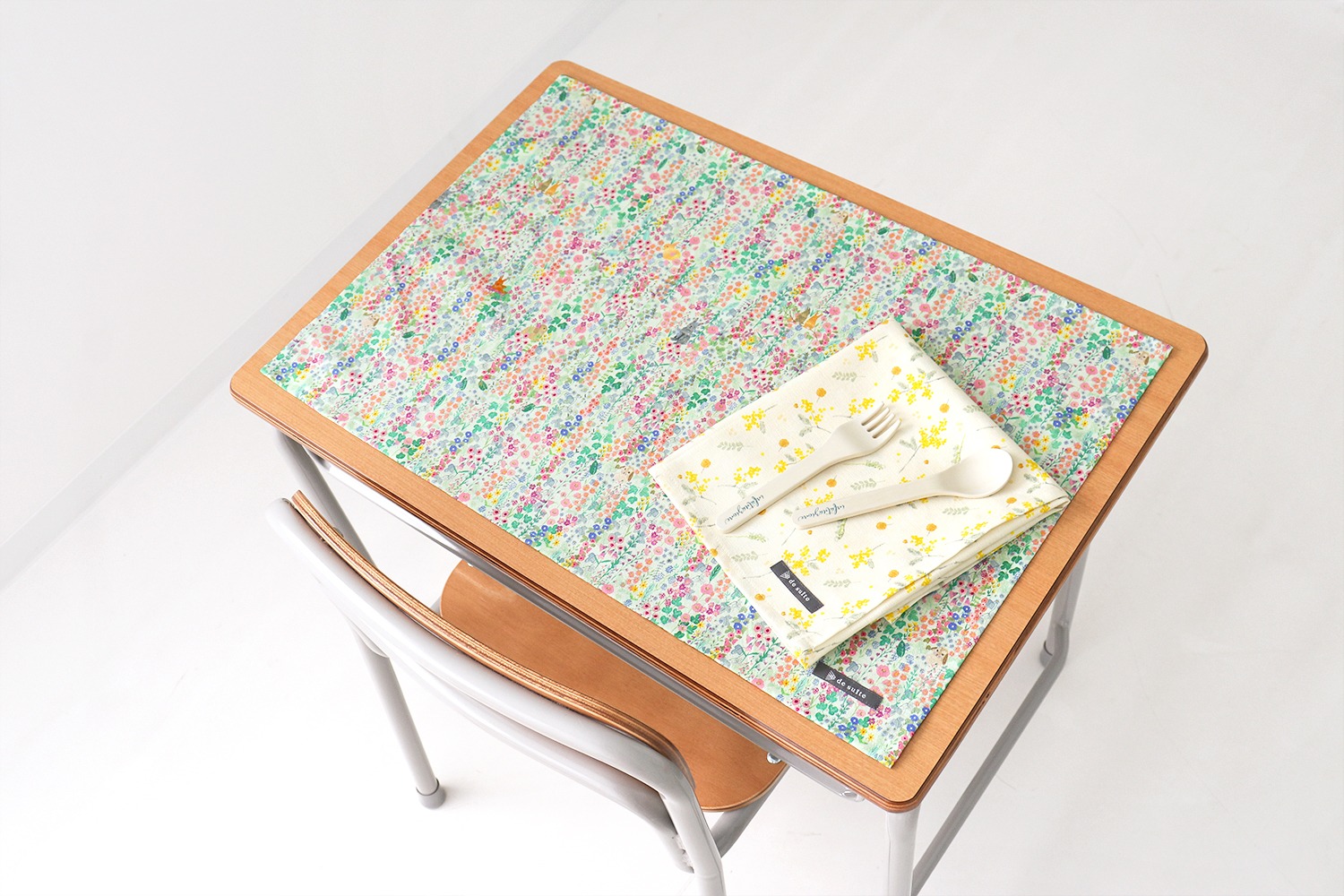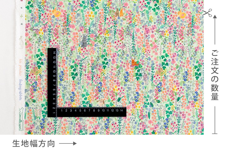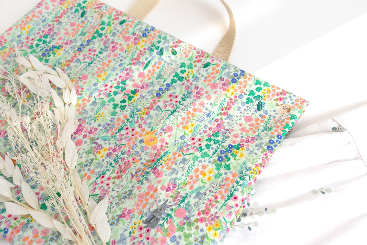 ライトグリーン地の野原に、ピンクやブルー、イエローの草花が一面を埋め尽くし、 それに紛れて、ところどころひょっこりと顔を出すうさぎがとても可愛く愛らしいデザインです。
