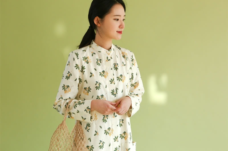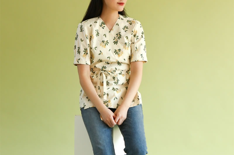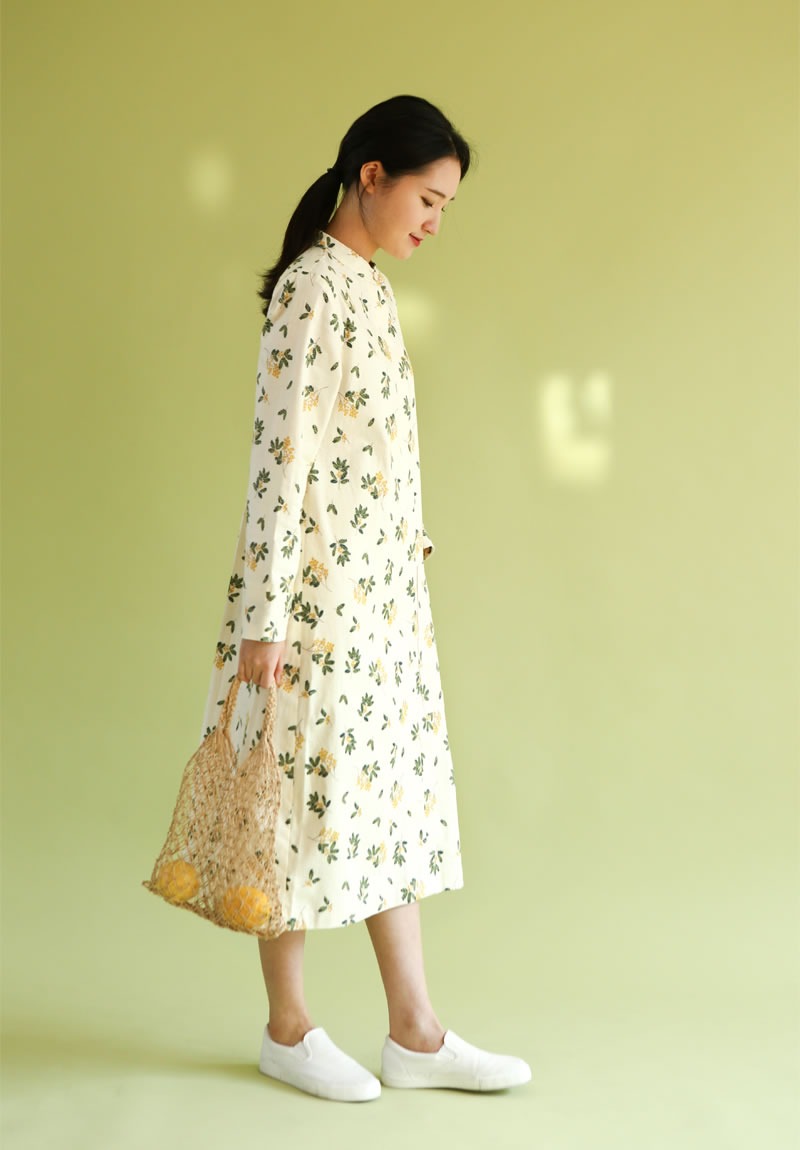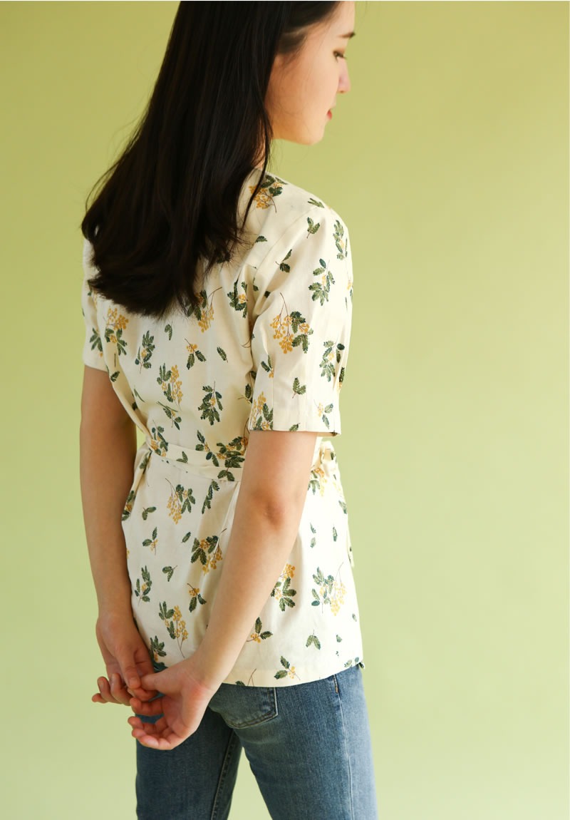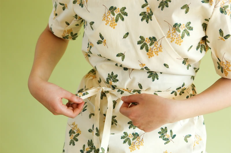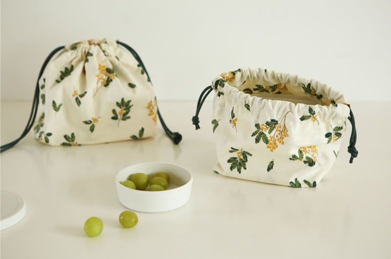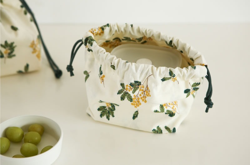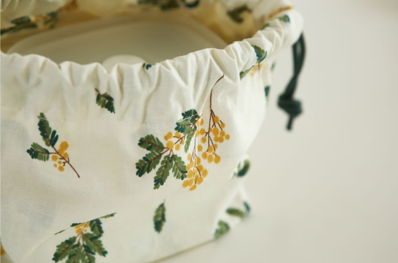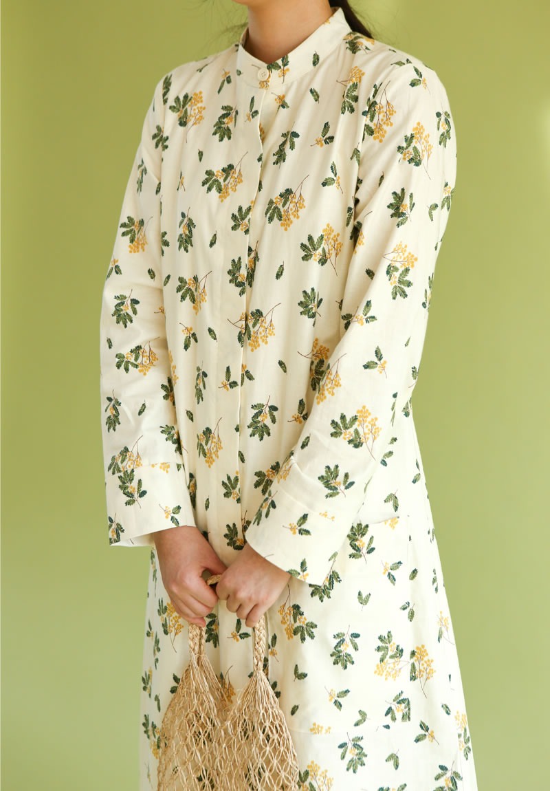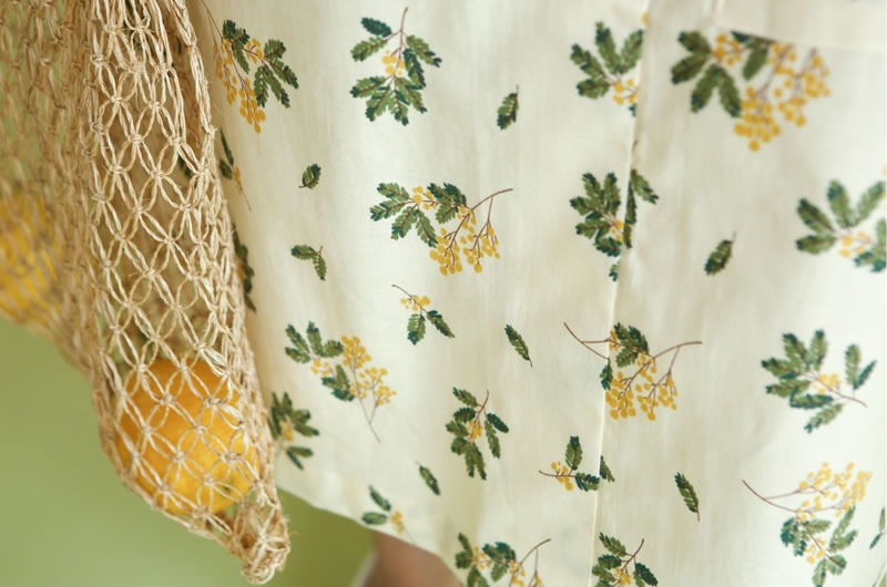 落ち着いたくすみクリーム地に、繊細なミモザの枝葉があたたかみを添える、上品なコットン生地です。