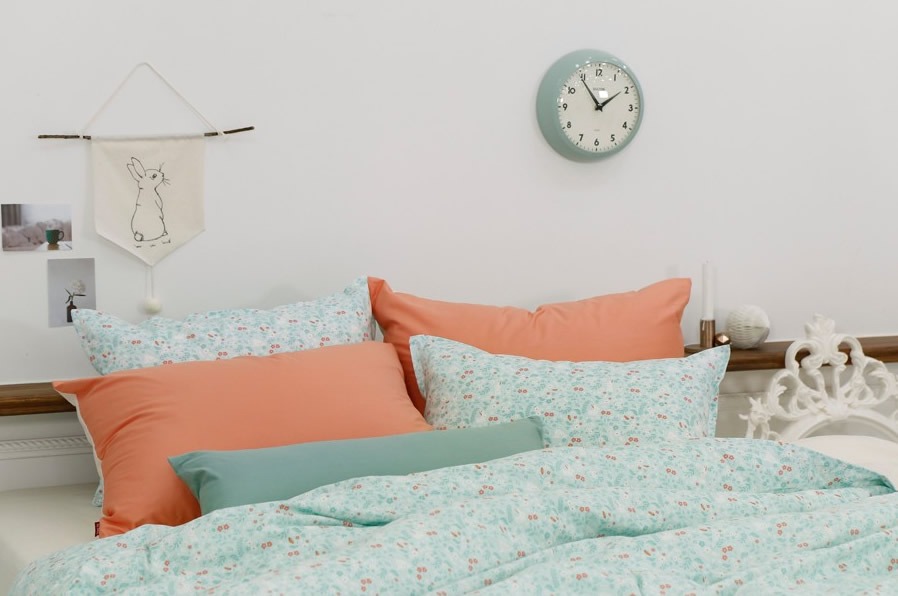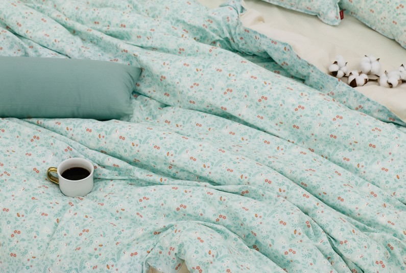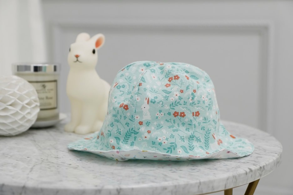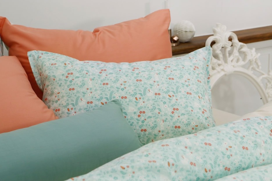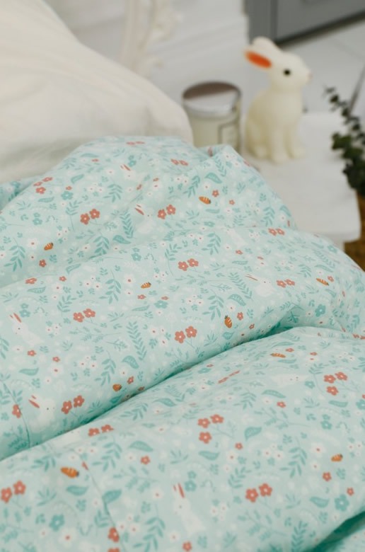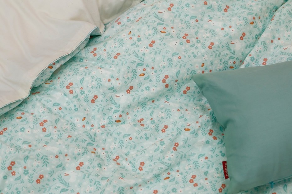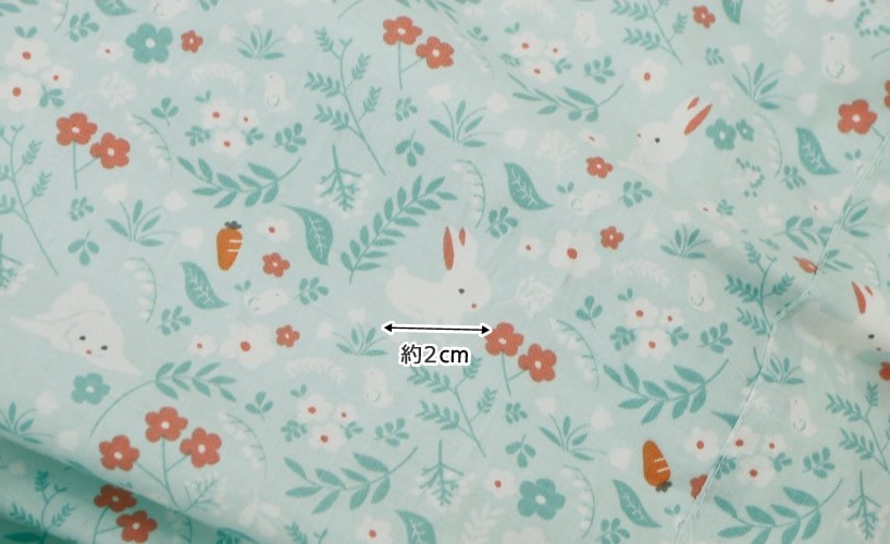 明るいミントグリーン地に描かれたうさぎや小鳥、小さな花々が可愛らしいコットン生地です。