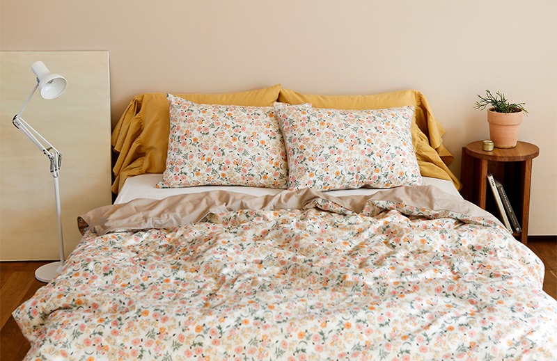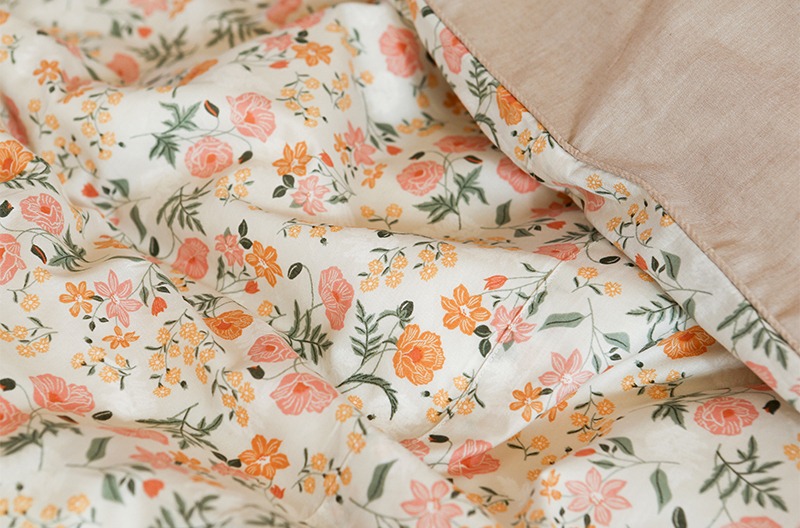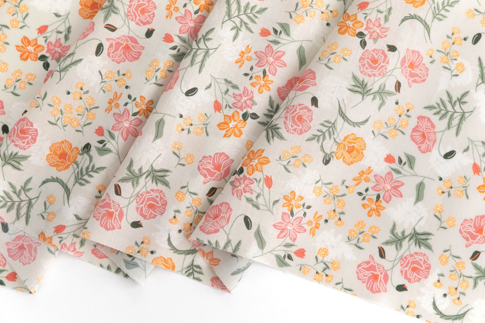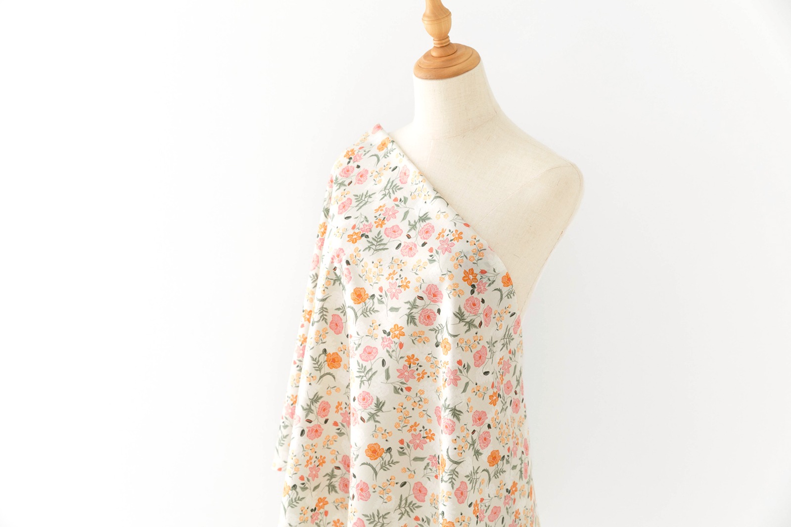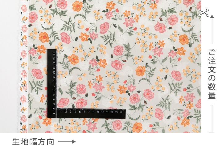 やわらかなグリーン寄りのアイボリー地に、オレンジやコーラルピンクの花々がふんわりと咲き